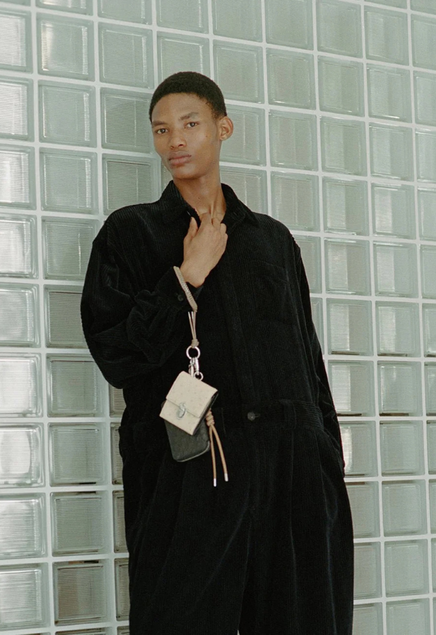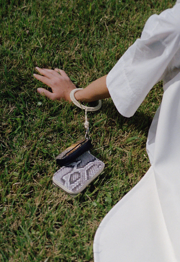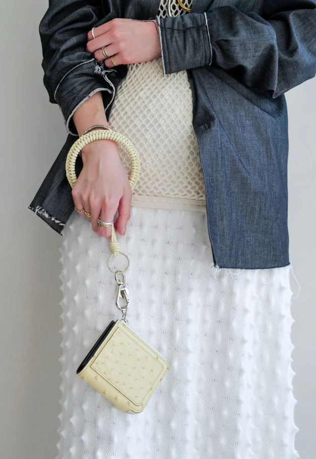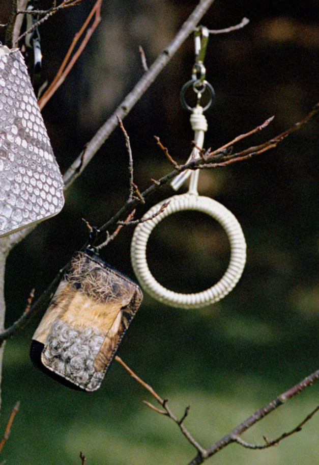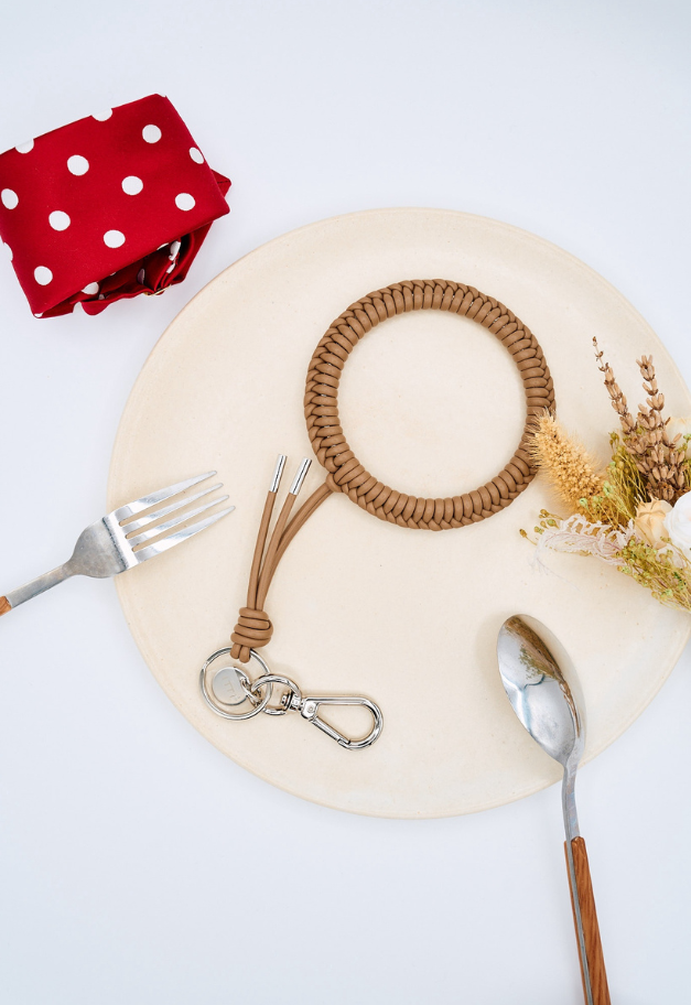 革紐をリング状に編み込み、手首が入るほどのサイズ感で仕上げたチャーム。スマートフォンのリングストラップやキーホルダー、バッグチャームとして、コーディネートにさりげないアクセントをプラスするアイテムです。さらに、ノベルティとしてスマートフォン取り付け用パーツが付属しており、実用性も兼ね備えています。