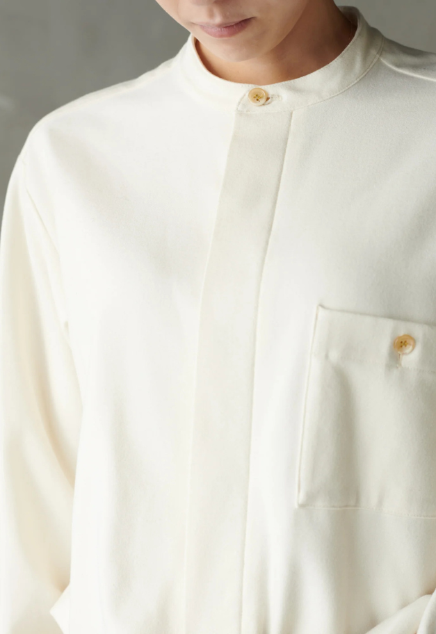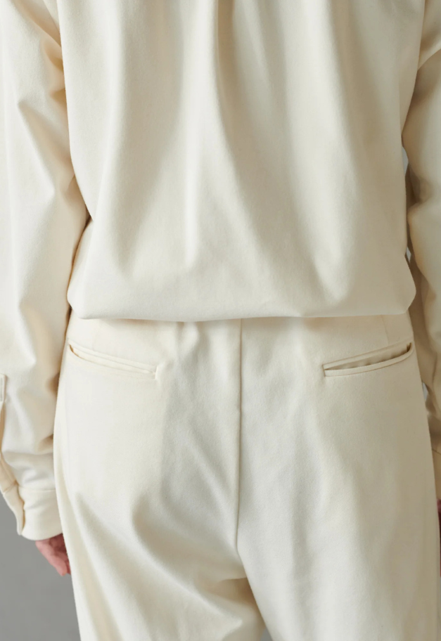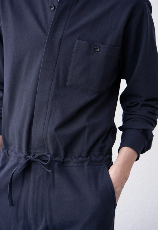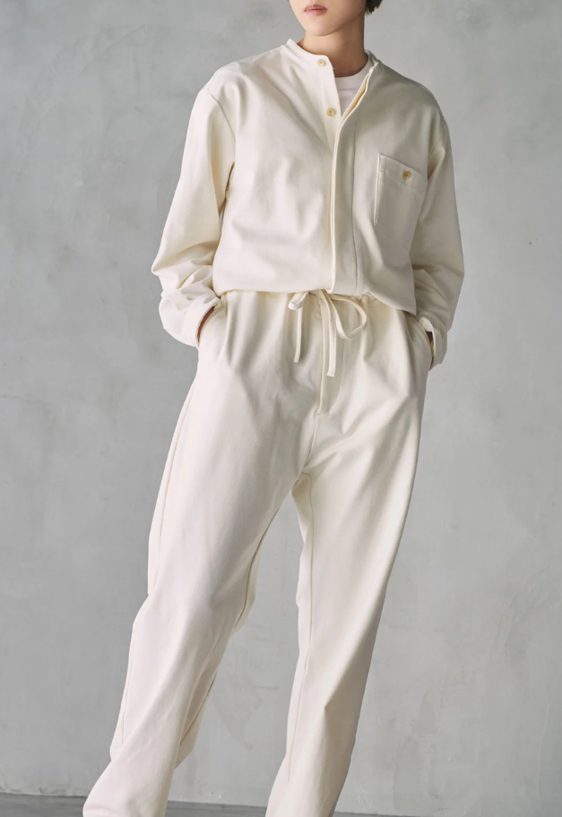 程よいゆとりとすっきりとしたシルエットが特徴のノーカラーオールインワン。