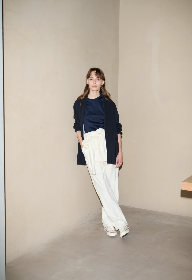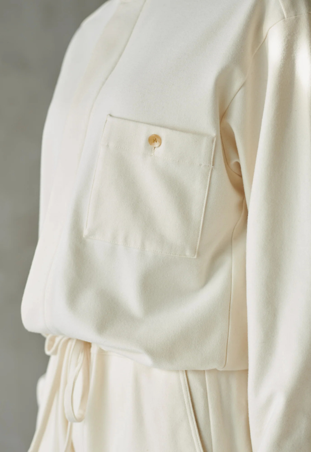 ウエストのスピンドルでブラウジングすることによりお好みのシルエットにアレンジして着用したり、また袖部分をウエストで結び、がらりとイメージを変えて着ていただいても。
