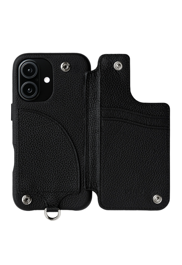 This item has an outstanding presence with its eye-catching design and texture. A convenient item with two card slits and a hidden pocket on the inside of the right door, and a storage pocket on the left side.