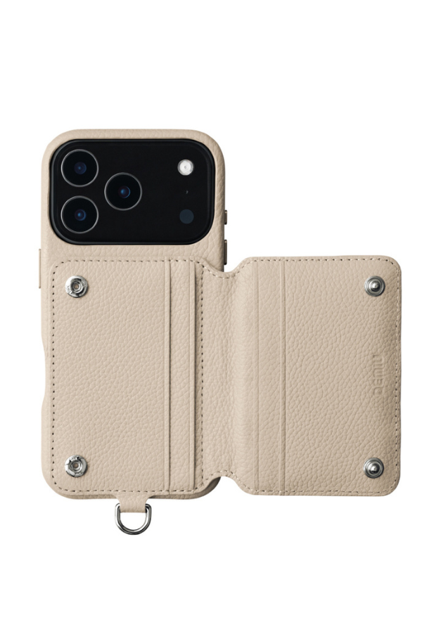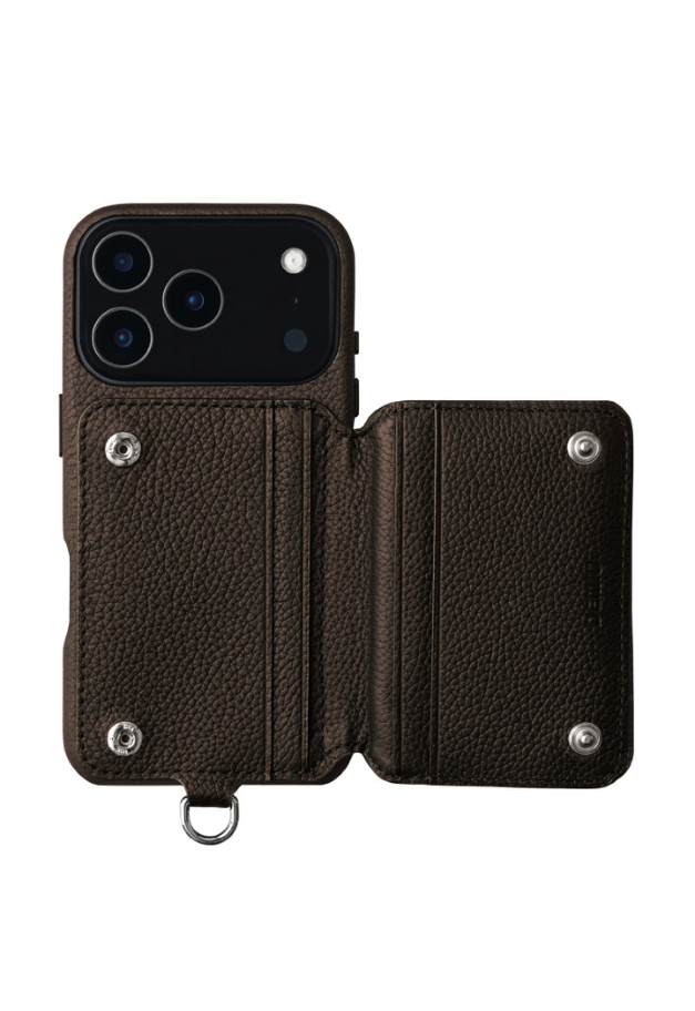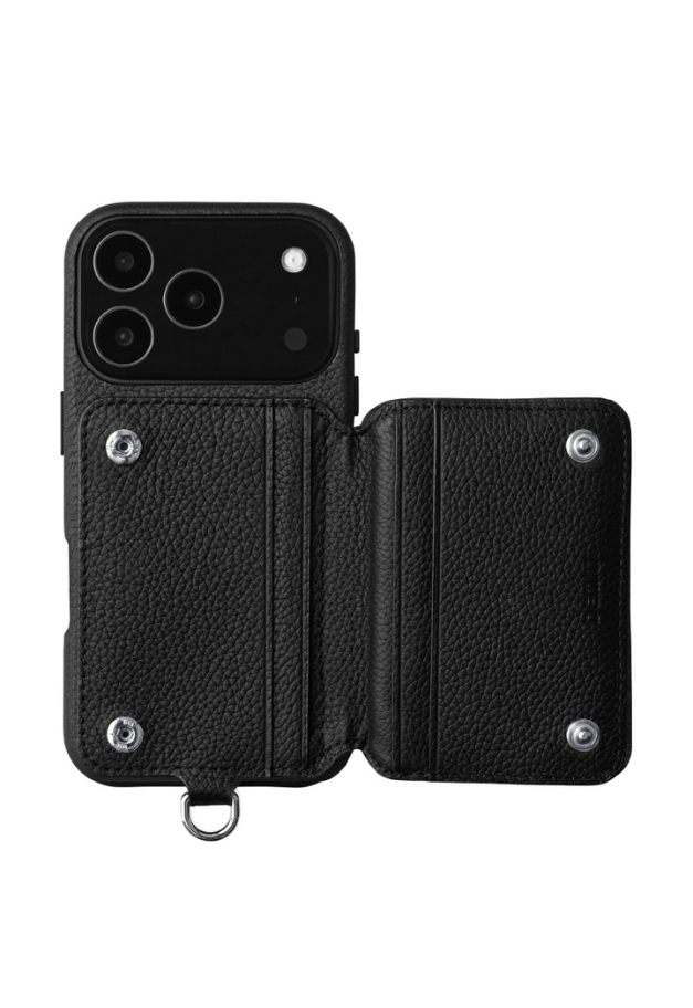 This item has an outstanding presence with its eye-catching design and texture. A convenient item with two card slits and a hidden pocket on the inside of the right door, and a storage pocket on the left side.