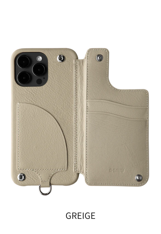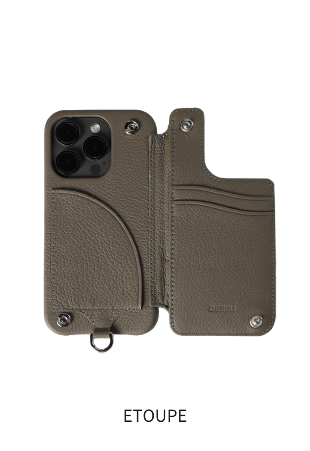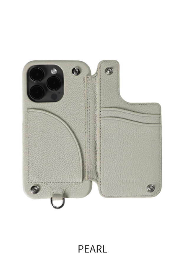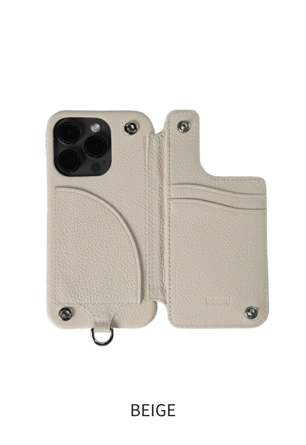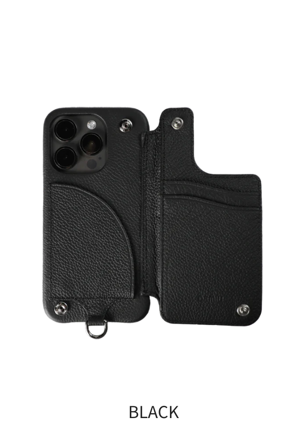 This item has an outstanding presence with its eye-catching design and texture. A convenient item with two card slits and a hidden pocket on the inside of the right door, and a storage pocket on the left side.