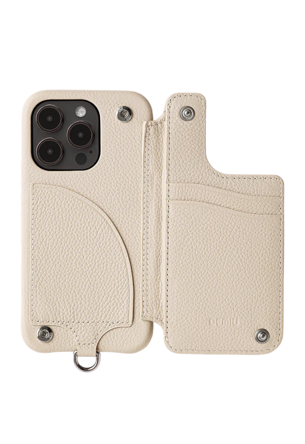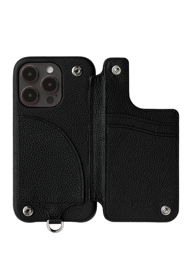 This item has an outstanding presence with its eye-catching design and texture. A convenient item with two card slits and a hidden pocket on the inside of the right door, and a storage pocket on the left side.