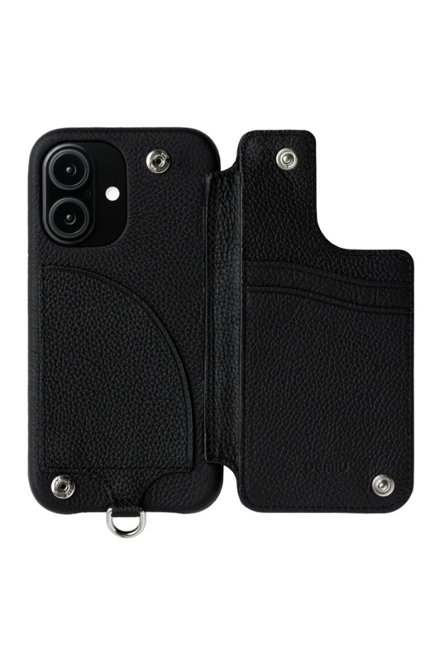 This item has an outstanding presence with its eye-catching design and texture. A convenient item with two card slits and a hidden pocket on the inside of the right door, and a storage pocket on the left side.