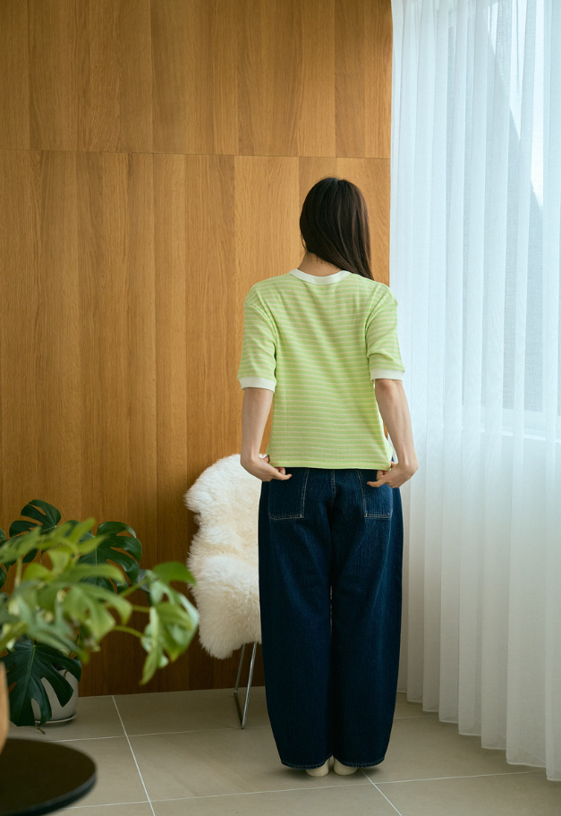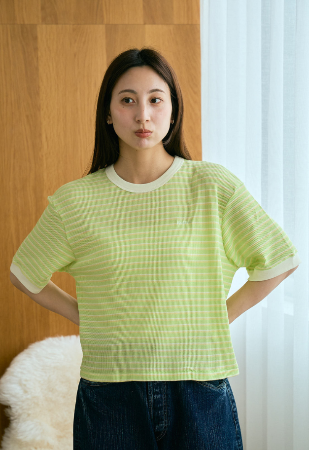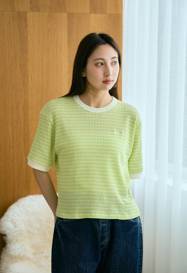 柔らかくしなやかな肌触りで好評を得ている定番のワッフル素材を、スタイリングのポイントになる70年代をイメージしたレトロな雰囲気のマルチボーダーに仕上げた。