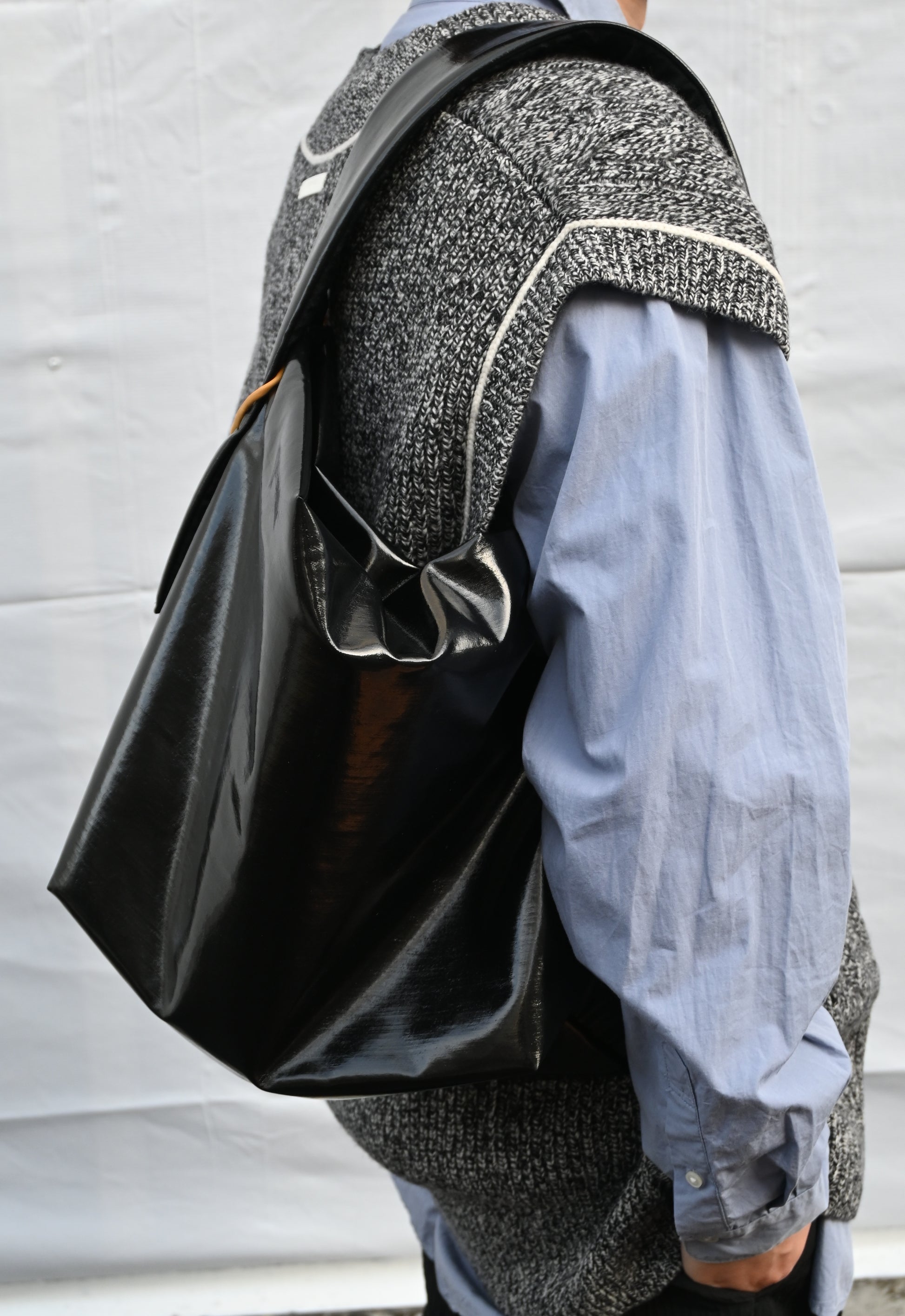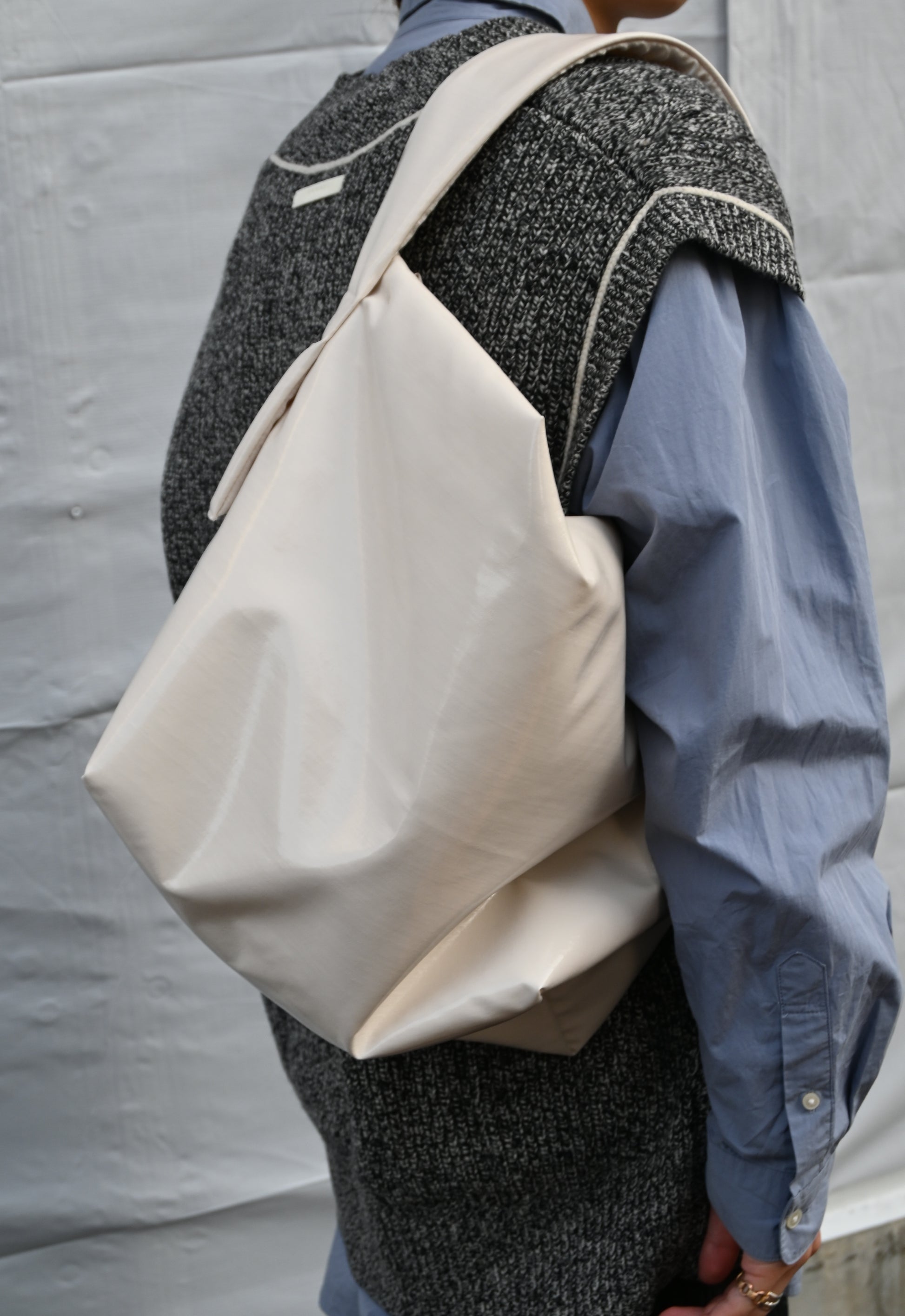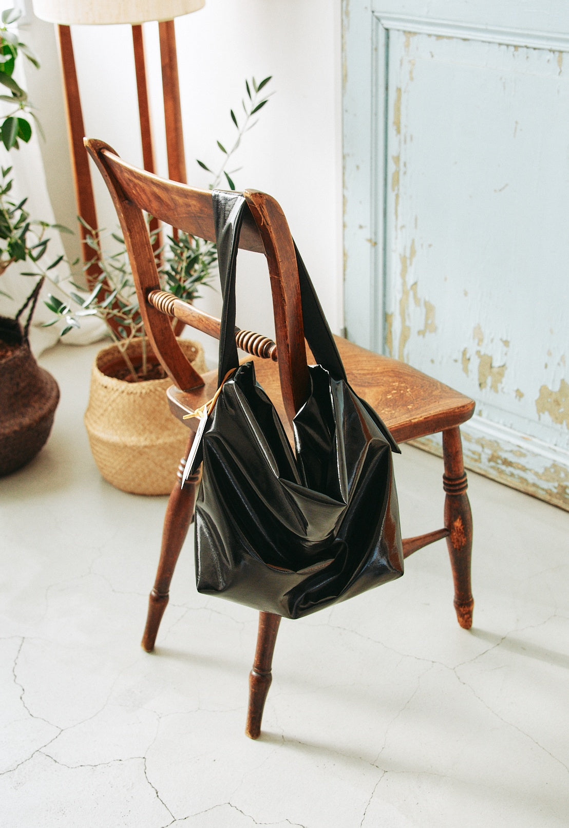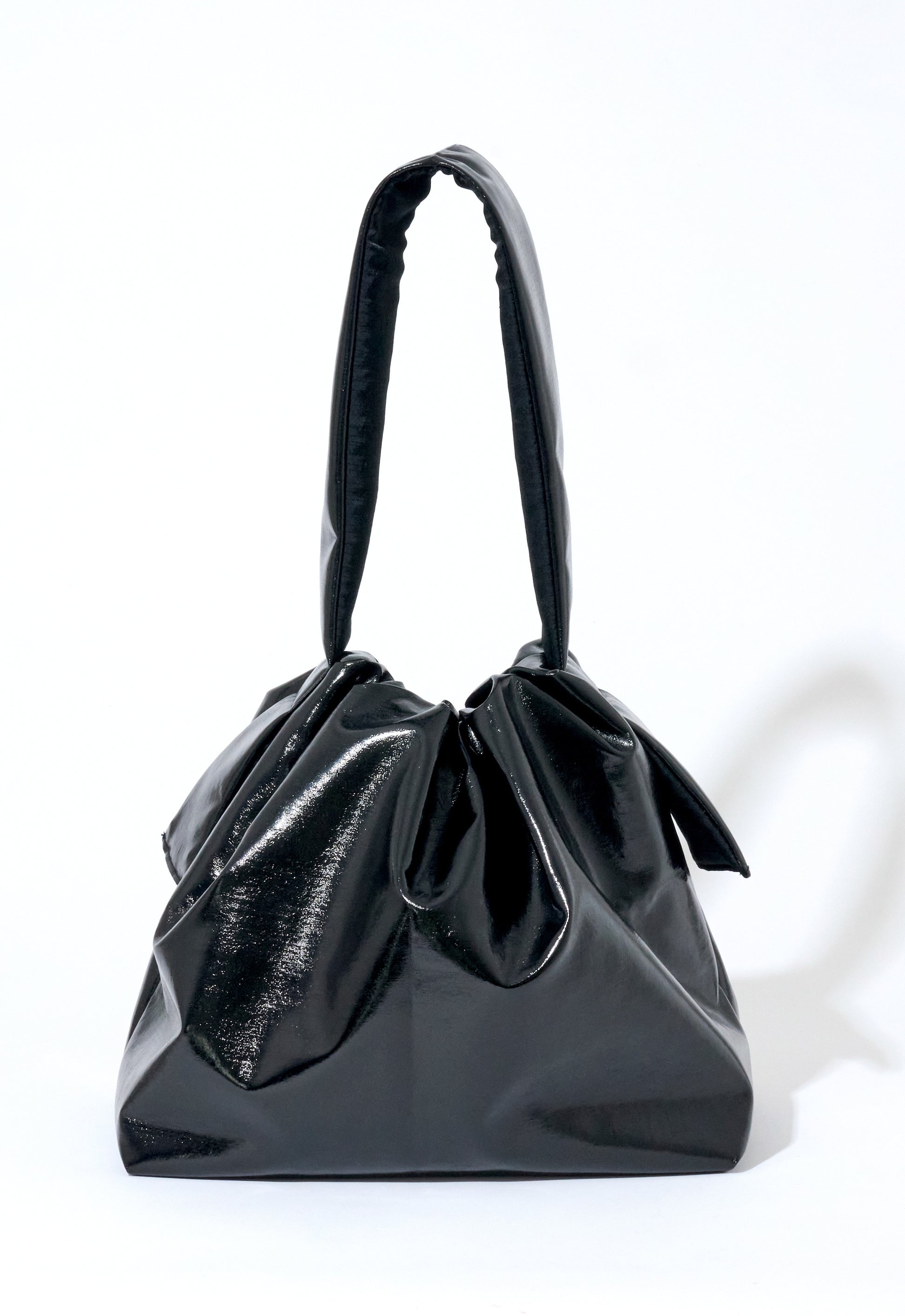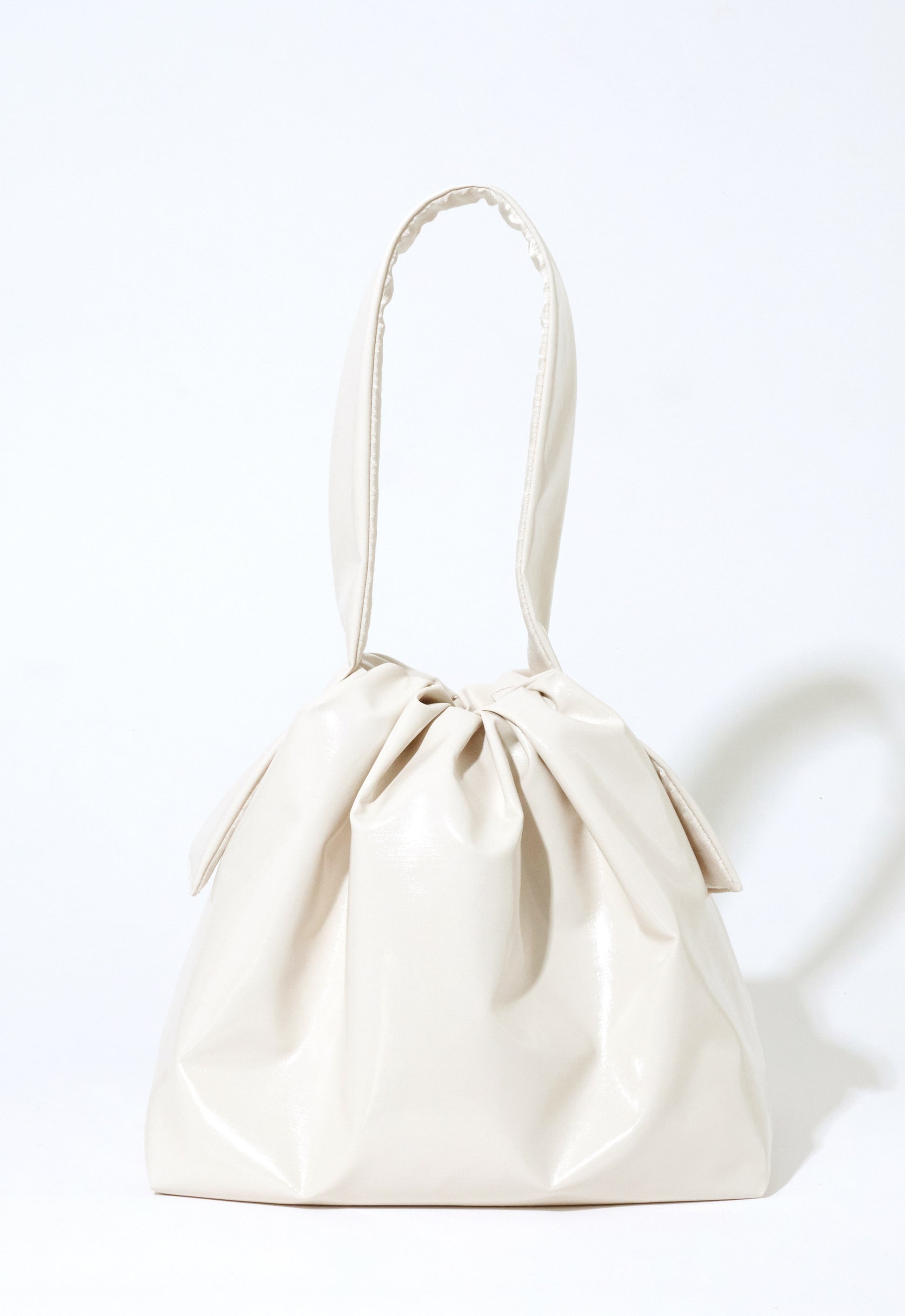 Shiny luster and plump silhouette. It has a drawstring closure that can be opened and closed with an internal drawstring, and the inside of the bag and the back of the handle that touches the skin are made of shantung fabric that is soft to the touch before being filmed.