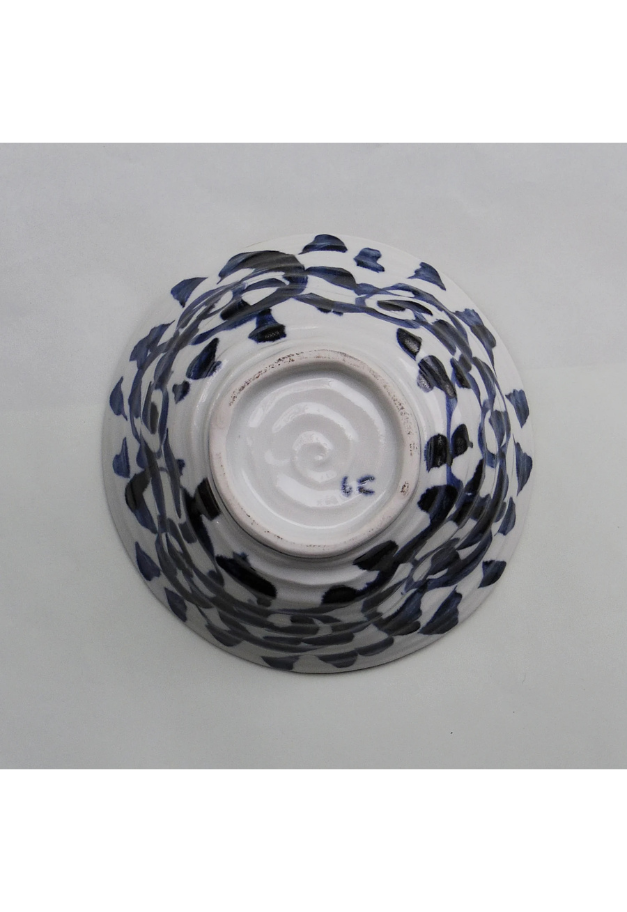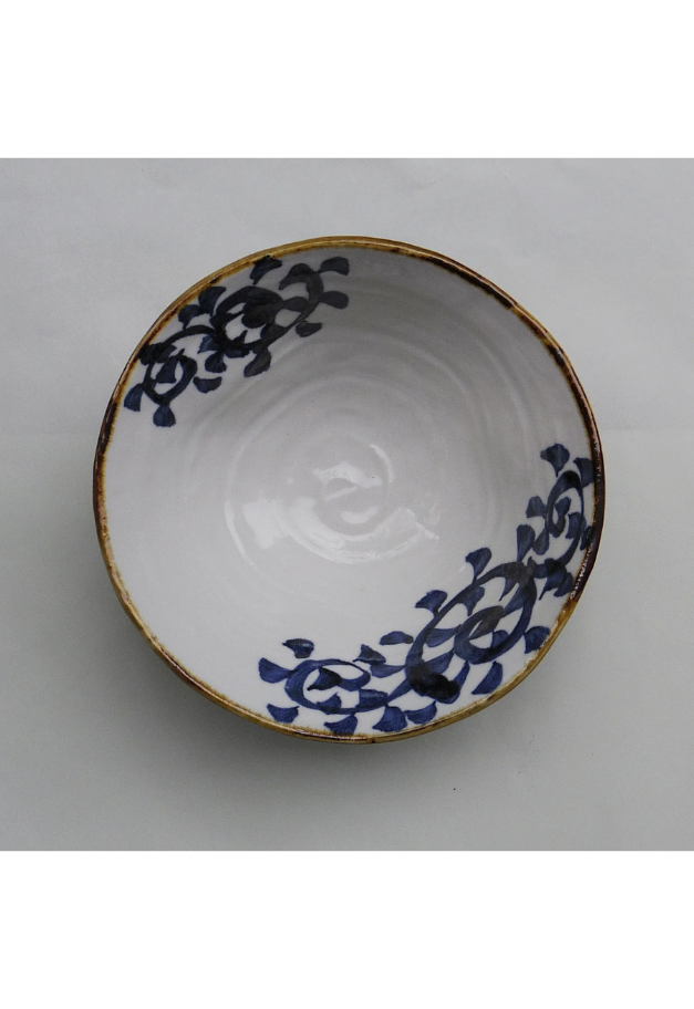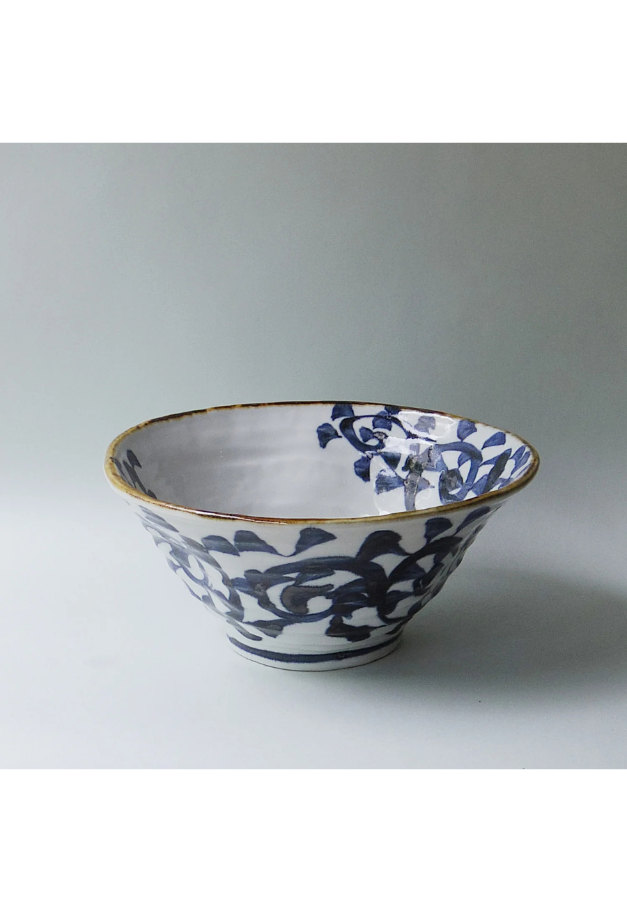 翔武窯の代名詞「タコ唐草」。 職人が描く大胆で縁起の良い染付の紋様は飽きが来ず不動の人気です。 持ちやすいよう二箇所に指押しがあり、モダンな反り型にロクロ目を施した日本らしいうつわです。