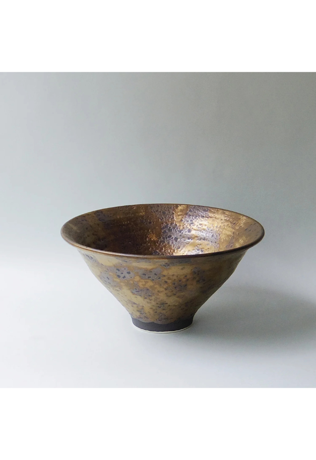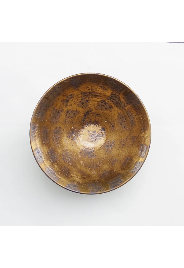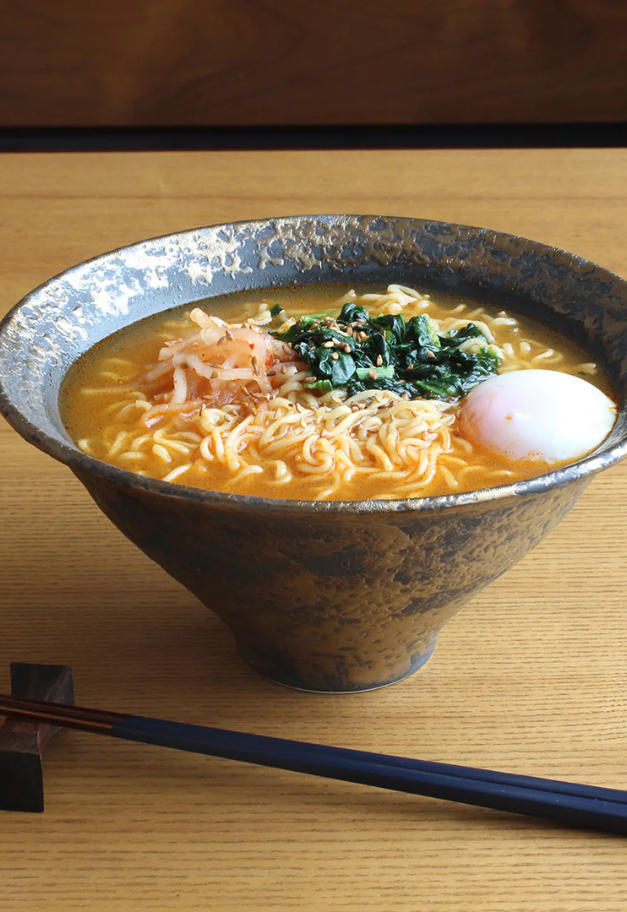 シックながらインパクトがある仕上がりの「金叩き」は、真っ赤な辛味の効いたラーメンが似合います。 黒地を塗った後に、金色の絵の具を手作業で勢いよく仕上げています。 麺はもちろんサラダなどの盛り鉢としてもテーブルを華やかにしてくれます。