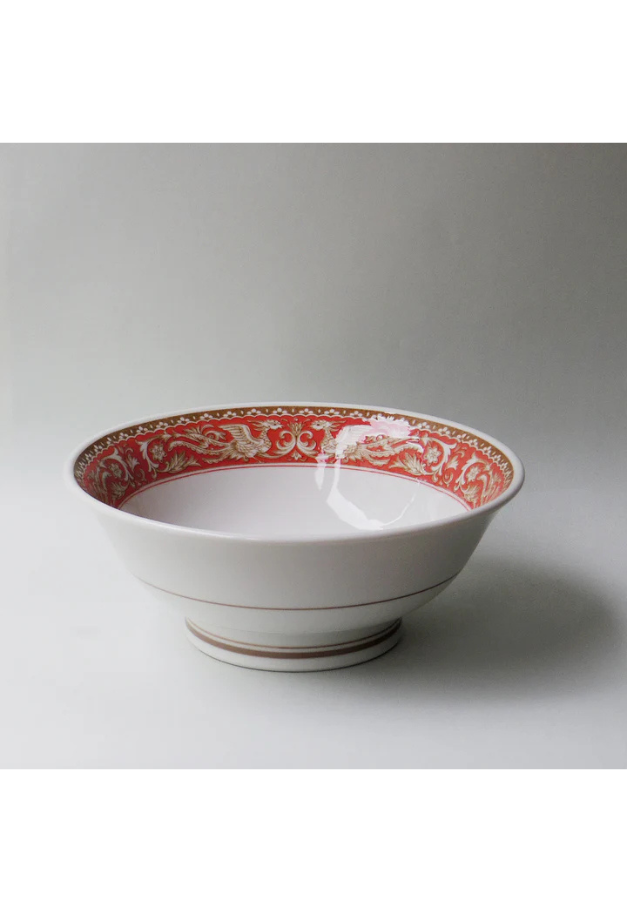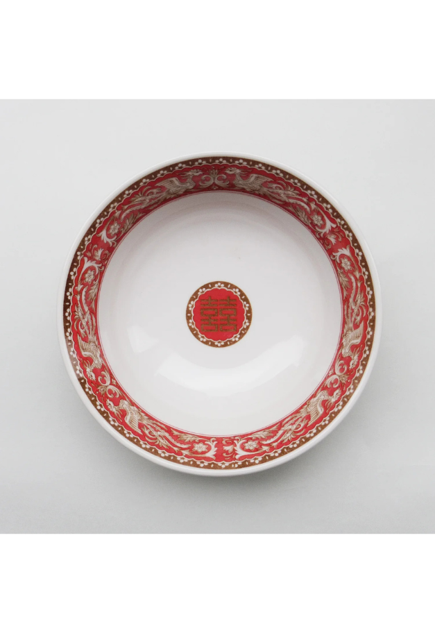 赤の鳳凰・見込み(底)の双喜紋が印象的なラーメン丼。どんなラーメンも美味しく見える赤絵は下絵付けのため、柄が薄くなることはありません。