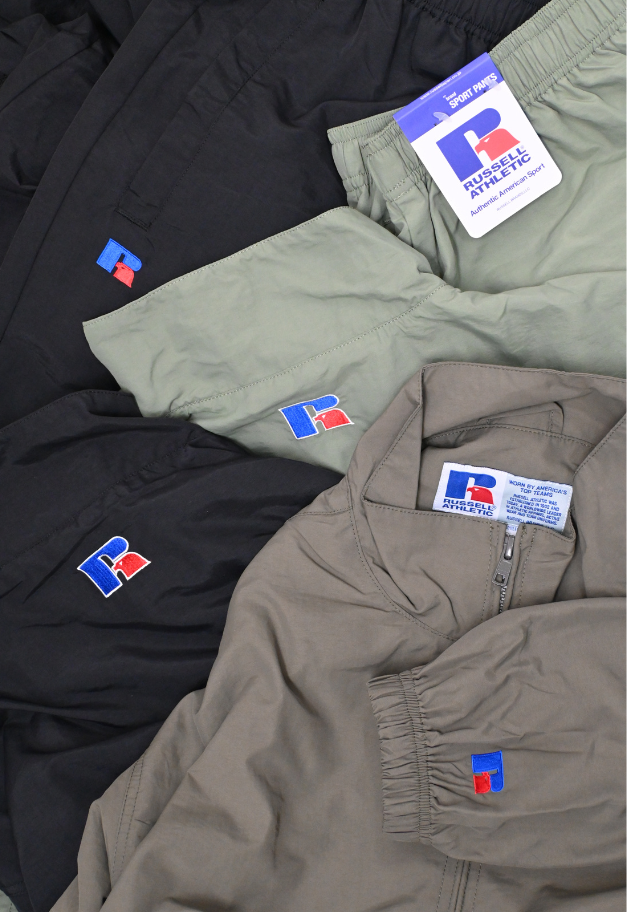 The design source is RUSSELL's warm-up training suits that were supplied to American college club teams in the 1990s.