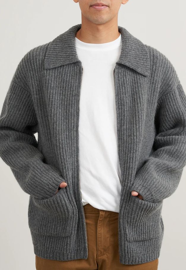 A knit cardigan with a distinctive pique pattern on the placket.