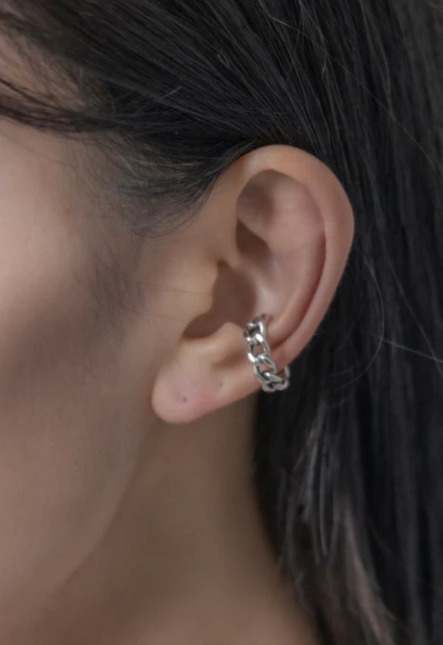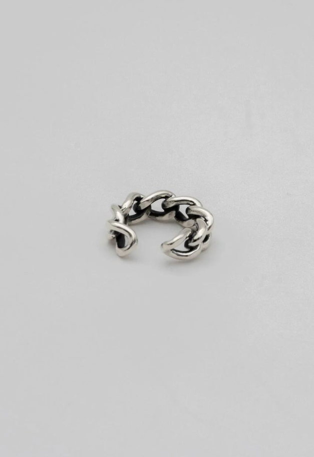 チェーンの隙間に燻し加工を施した、奥行きあるデザインが特徴のモード感溢れるイヤーカフ。
