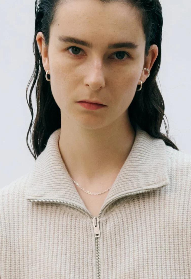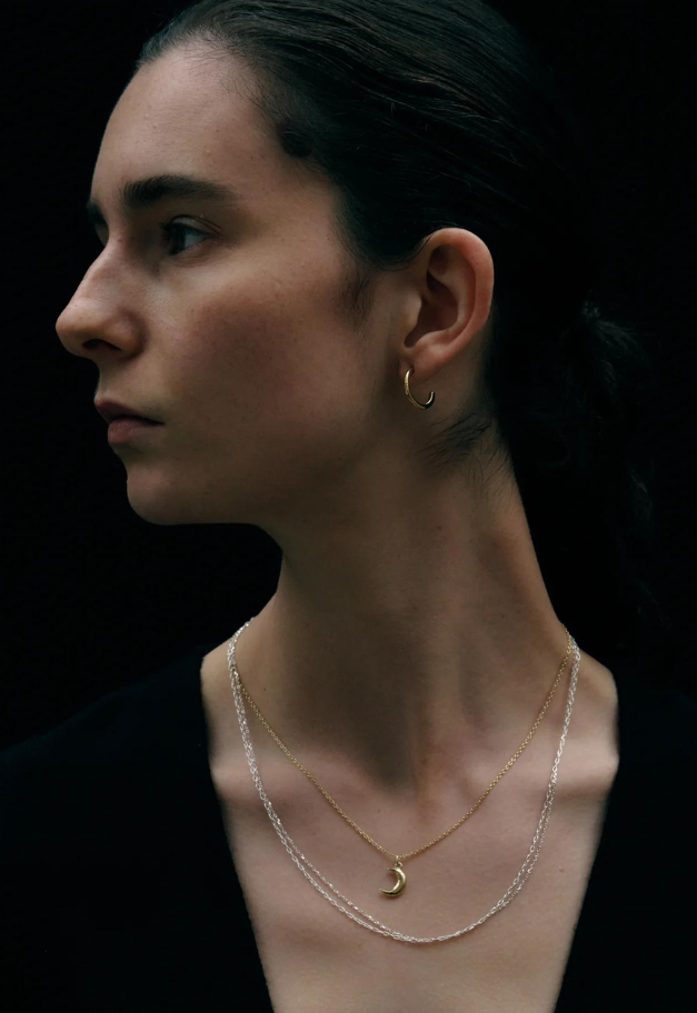 2連の異なるチェーンが手元で繊細な輝きを放つネックレス。