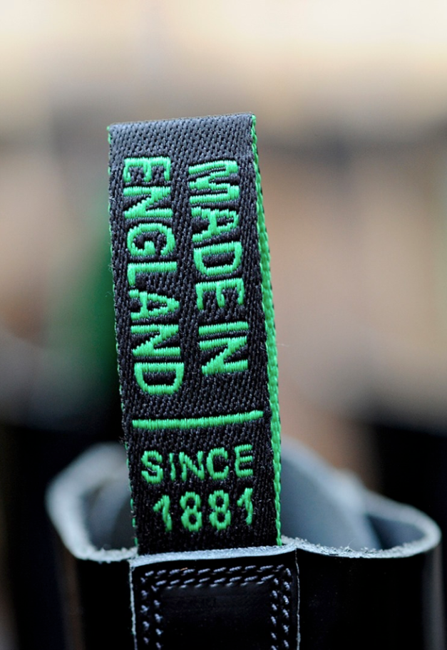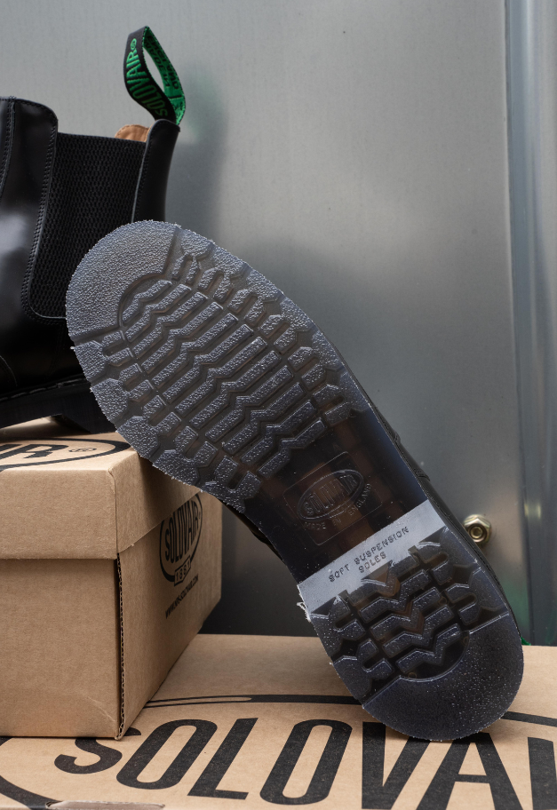 High-shine (mirror finish) leather dealer boots made using the traditional Goodyear welt method.