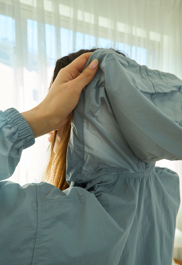 WILD THNGSの春夏の中で最も軽く薄いナイロンのタイプライター素材を使用したスキッパープルオーバーパーカー。 撥水加工とUVカットに加え、塩素処理対応で軽い水遊びにも適している。 ウエストをアジャストする事でシルエットの変化を楽しむことができ、水着の上からでもバサッと被れるオーバーサイズ。 バックヨークの下はメッシュで切り替えたベンチレーション仕様。 脇下には水抜けと通気性を考慮したハトメをうっている。 今回はバスト部分を大幅に広くアップデート。