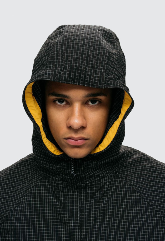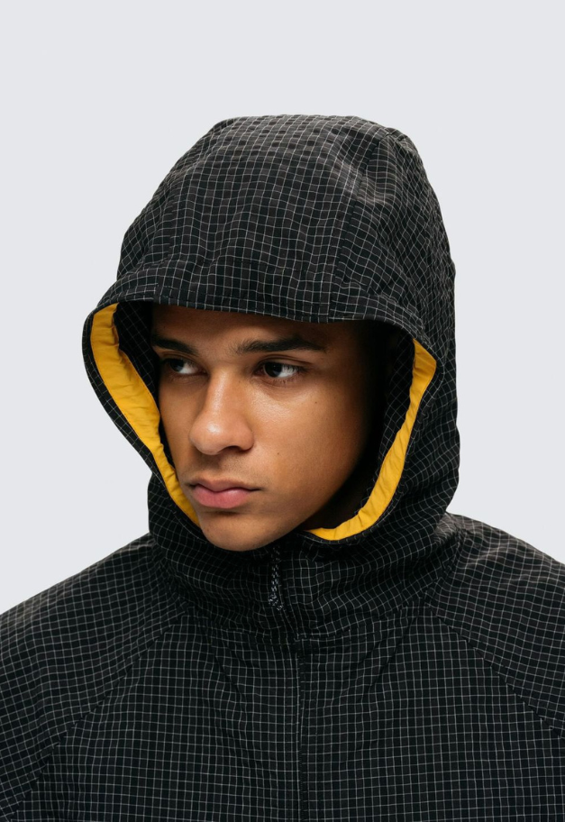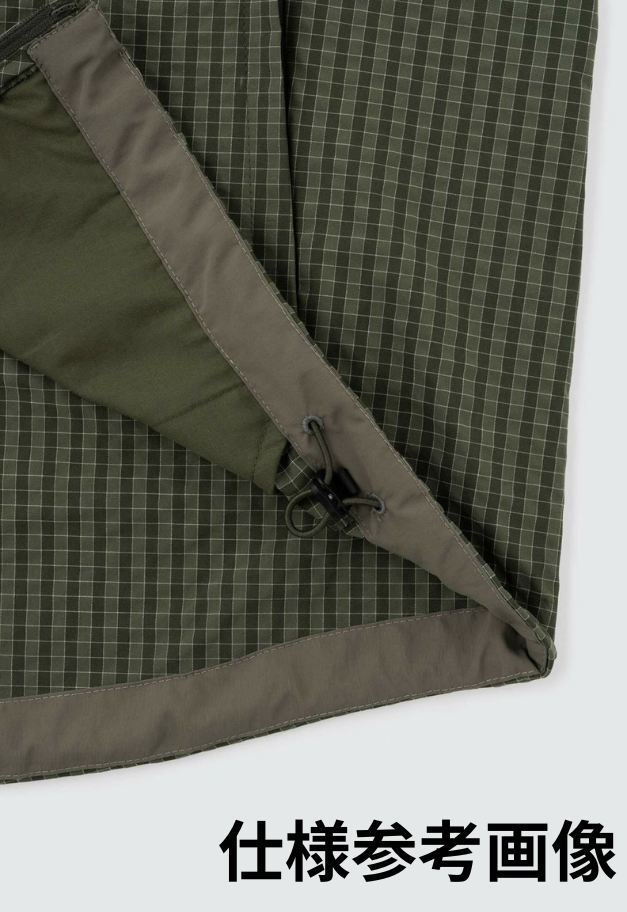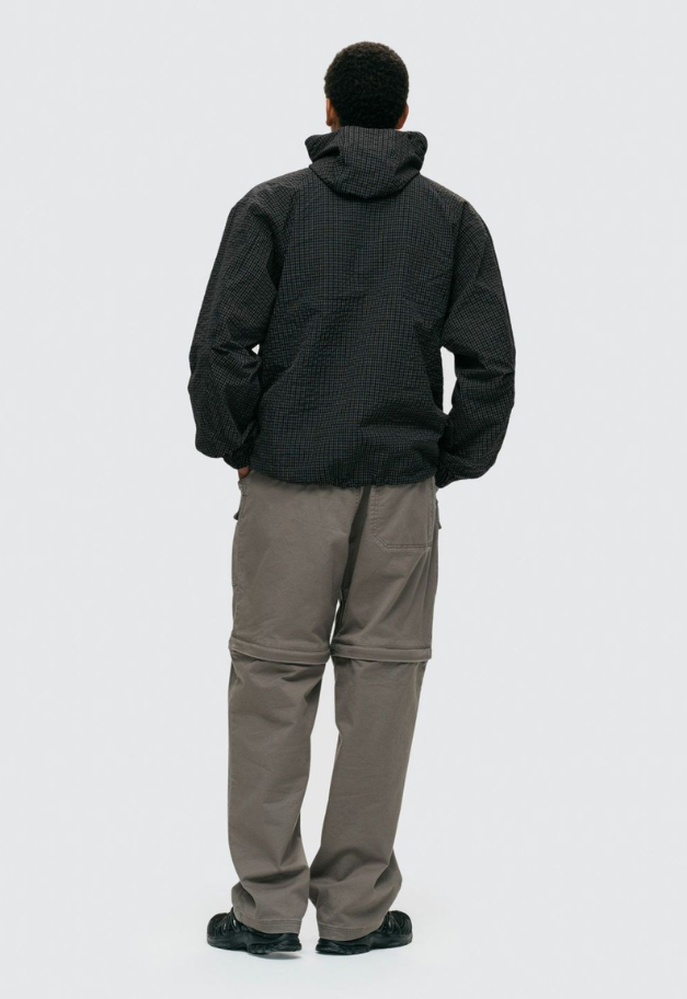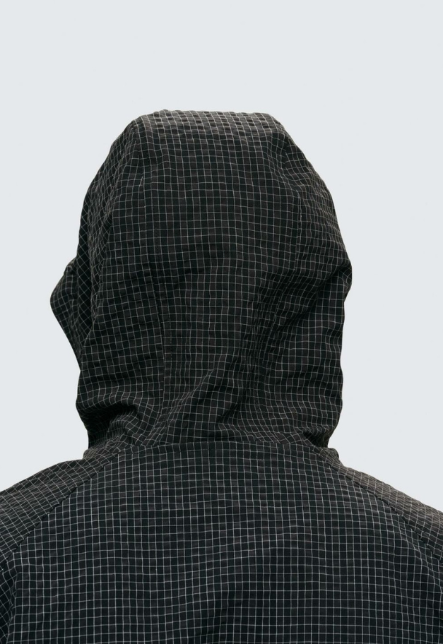 表面の凹凸に因んでGECKO(ヤモリ)と名付けられた、サッカー調のシボが特徴のポリエステル/レーヨンの チェック生地を使ったシンプルなジップパーカー。 フード衿を高く、ファスナーを長めに設計したことで、全閉の際は首までしっかりと覆うことが可能。 春夏向けに1枚仕立てで軽くしているが、適度にハリのある素材を採用することで立体感のあるシルエットとなっている。