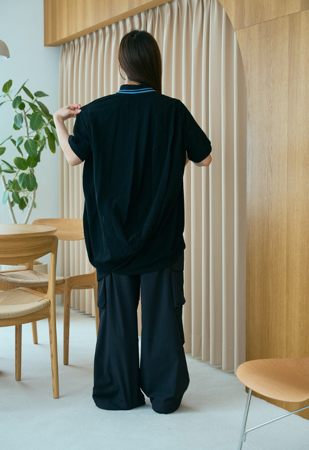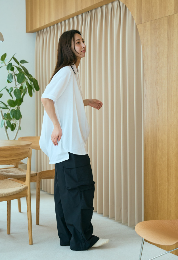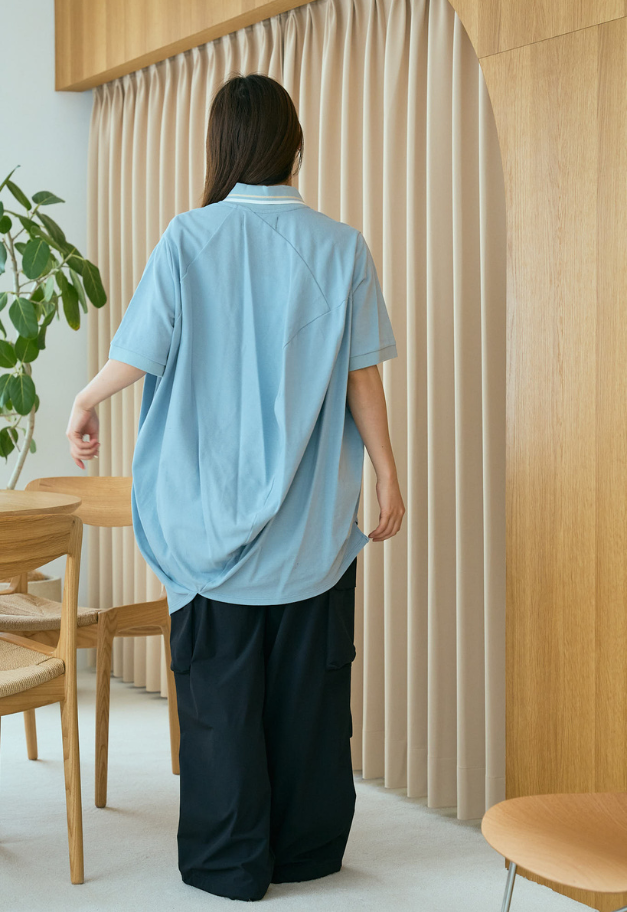 ボールの立体に着せ付けることができるパターンを用いたポロシャツは、身体に添うことで規則的だった形が自然なドレープとなり、ボリュームのあるシルエットに変換されます。