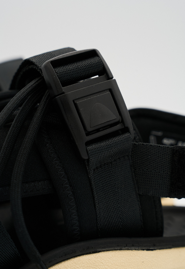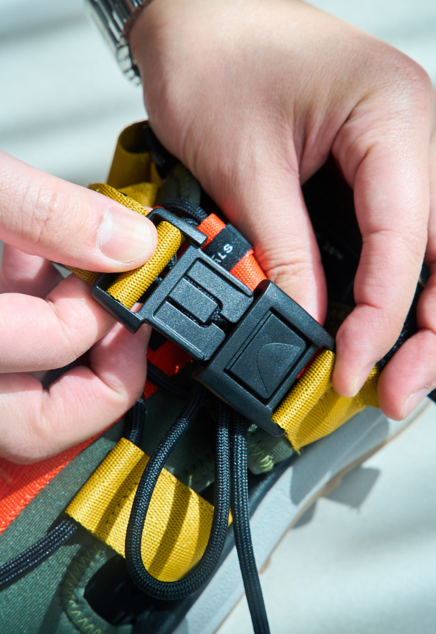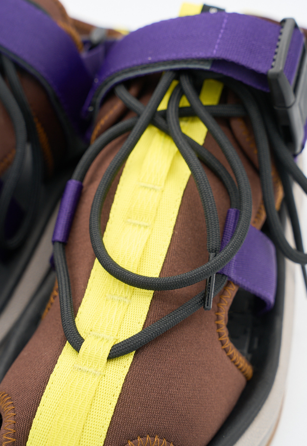 ハイレベルなデザインを持つアッパー部分が特徴で、柔らかなメッシュのカットアウトがセキュアなフィット感を提供し、YKKのクイックリリースバックルを備えています。