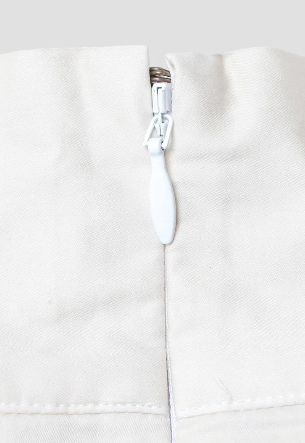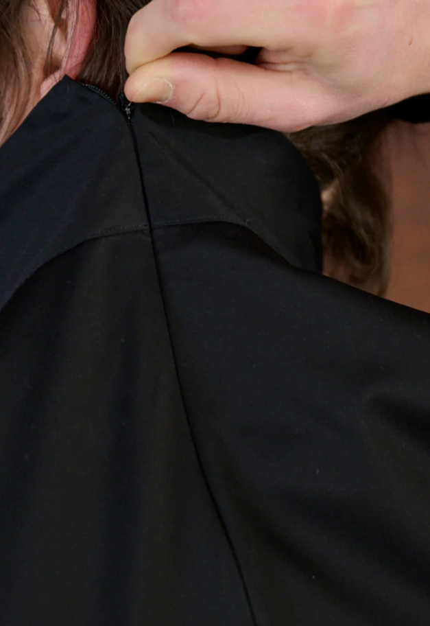 着脱のしやすさとスッキリとしたデザインを考慮し、背中に深めのコンシールファスナーをつけました。