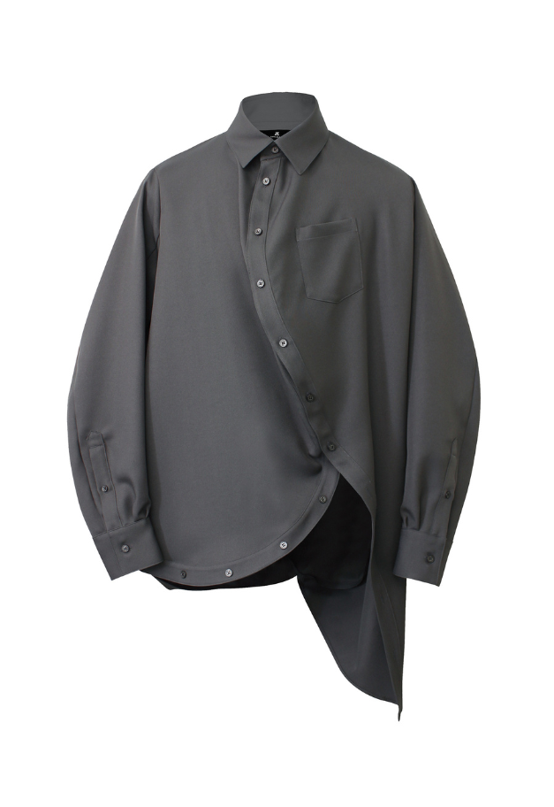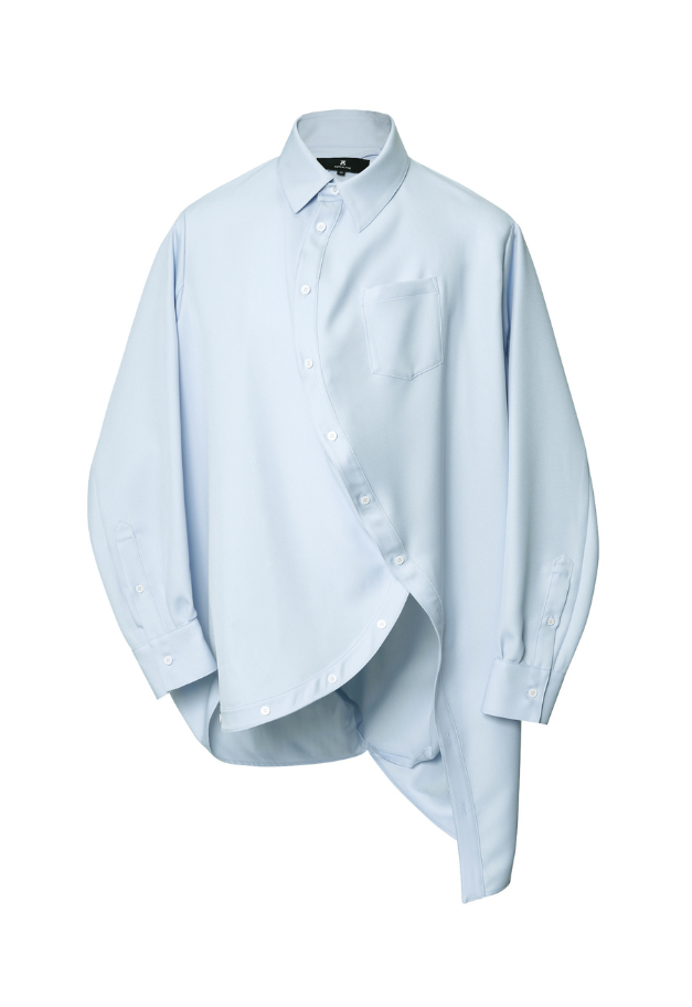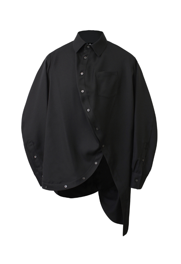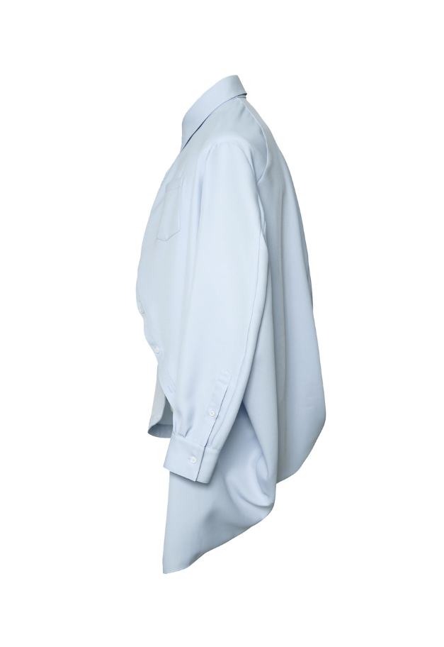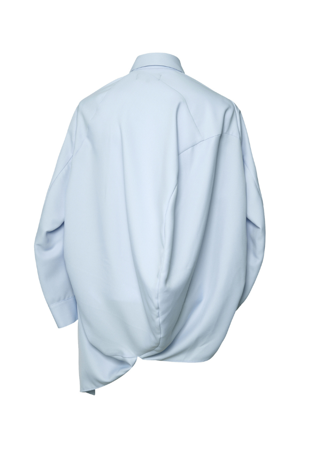 ボールの立体に着せ付けることができるパターンを用いたシャツは、身体に添うことで規則的だった形が自然なドレープとなり、ボリュームのあるシルエットに変換されます。