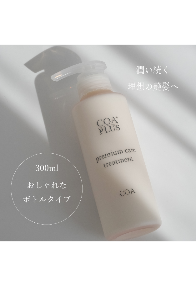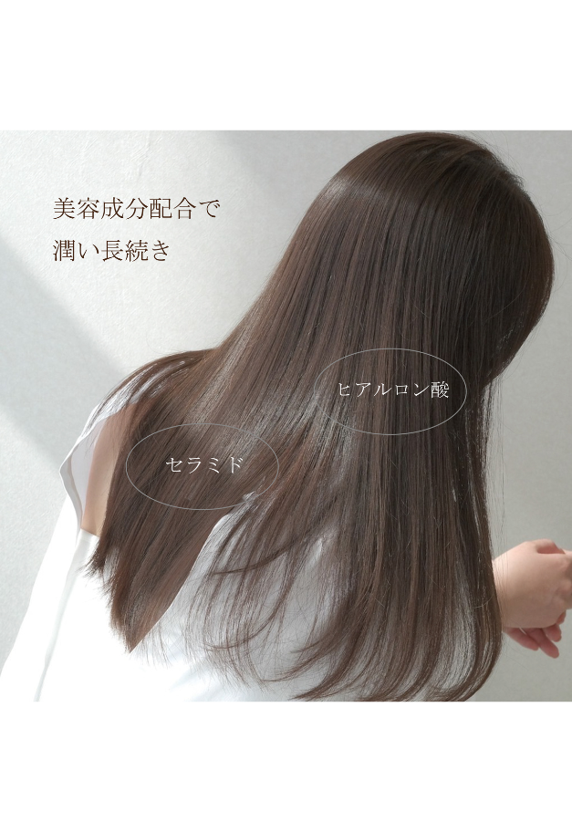 ヒアルロン酸、セラミド配合によりしっとり潤いのある、指通りの良い艶髪に, 髪につけた瞬間から馴染みが良く、べたつかず柔らかな質感に仕上がります。髪質問わず、全ての髪質の方にデイリーにお使いいただけます。またCOAシャンプーと相性がよく、ライン使いしていただくと効果を感じやすいです。