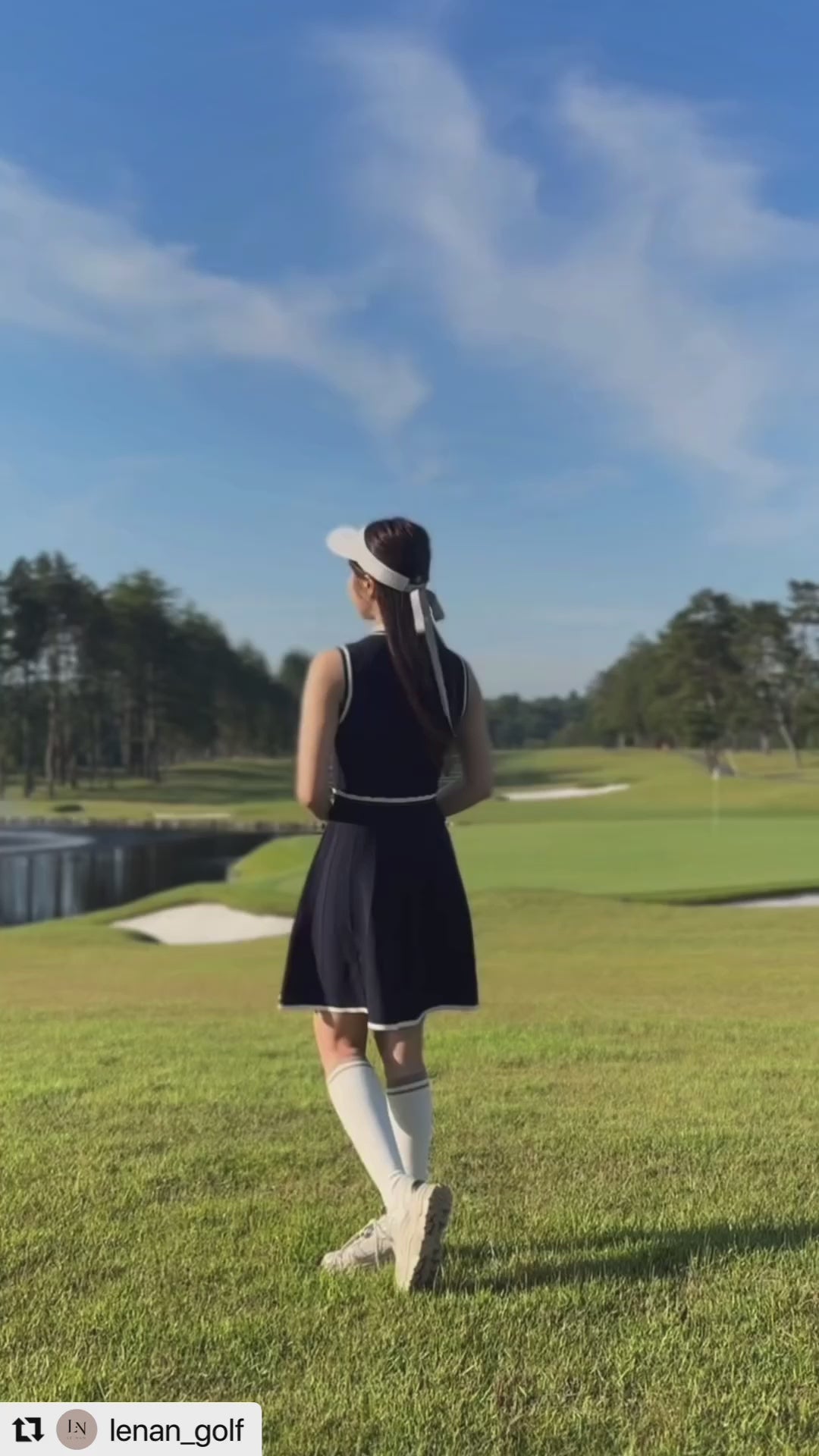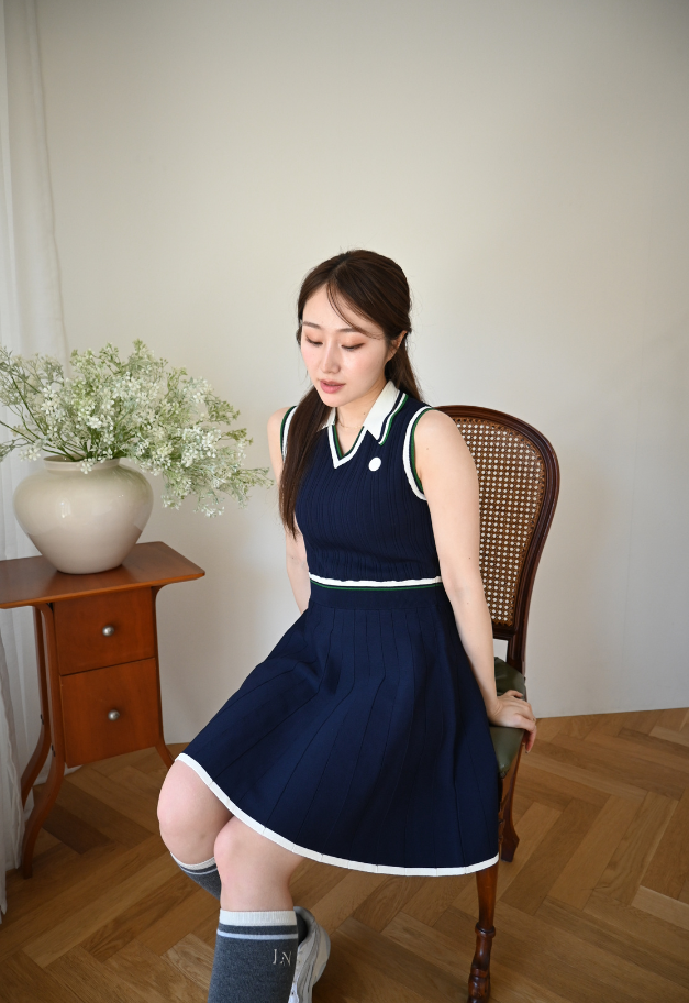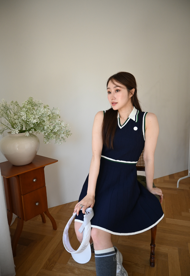 LE.NAN Line-Patterned Ribbed Knit Golf Dress【NAVY】