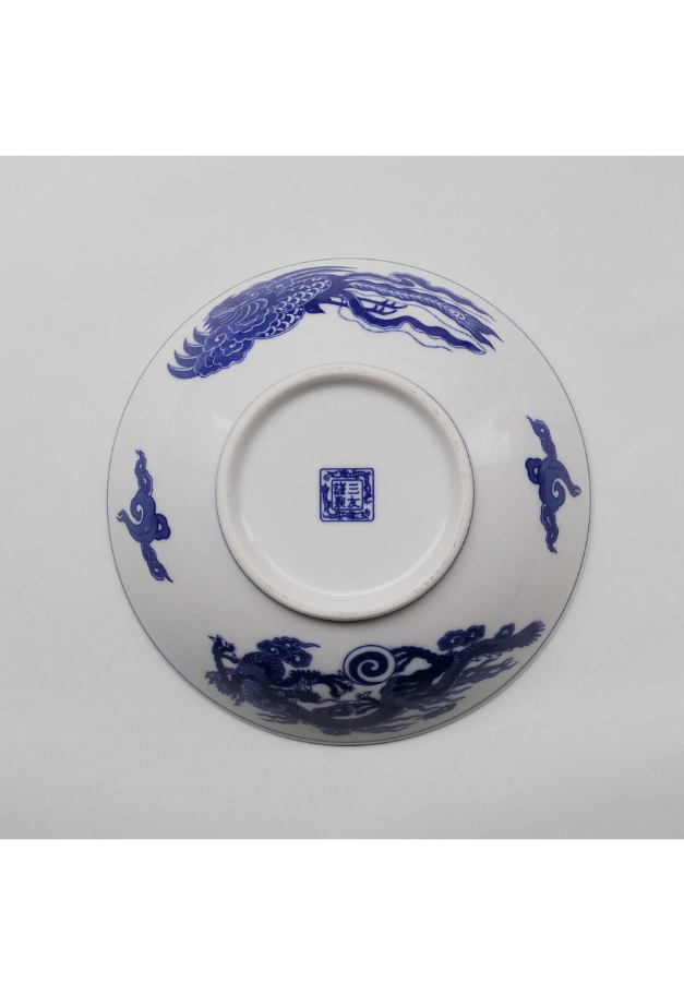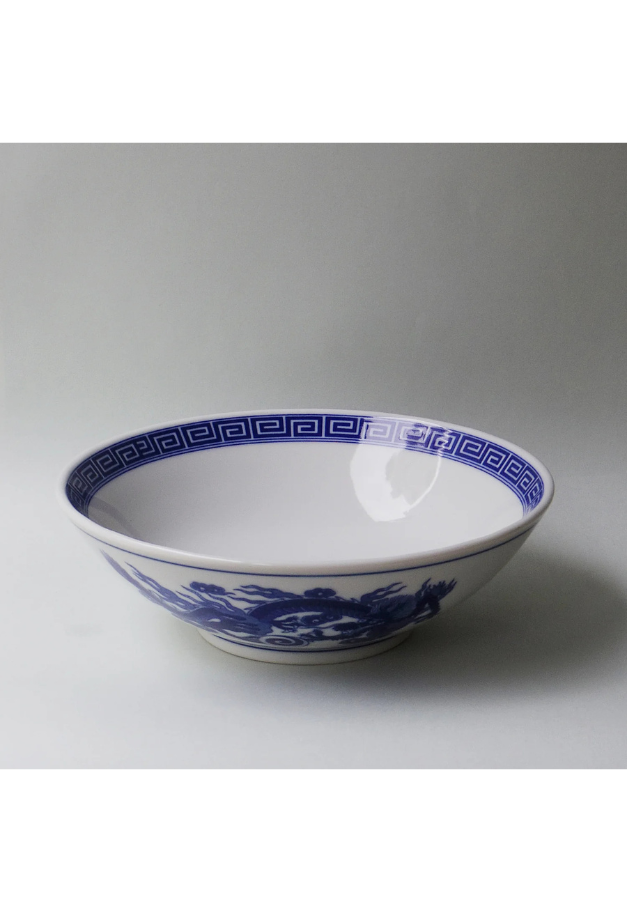混ぜそばや冷やし中華・天津飯に嬉しい浅型仕様の中華丼。内側の双喜紋・雷紋、外側の雲龍の銅版転写は一点一点職人による手張りです
