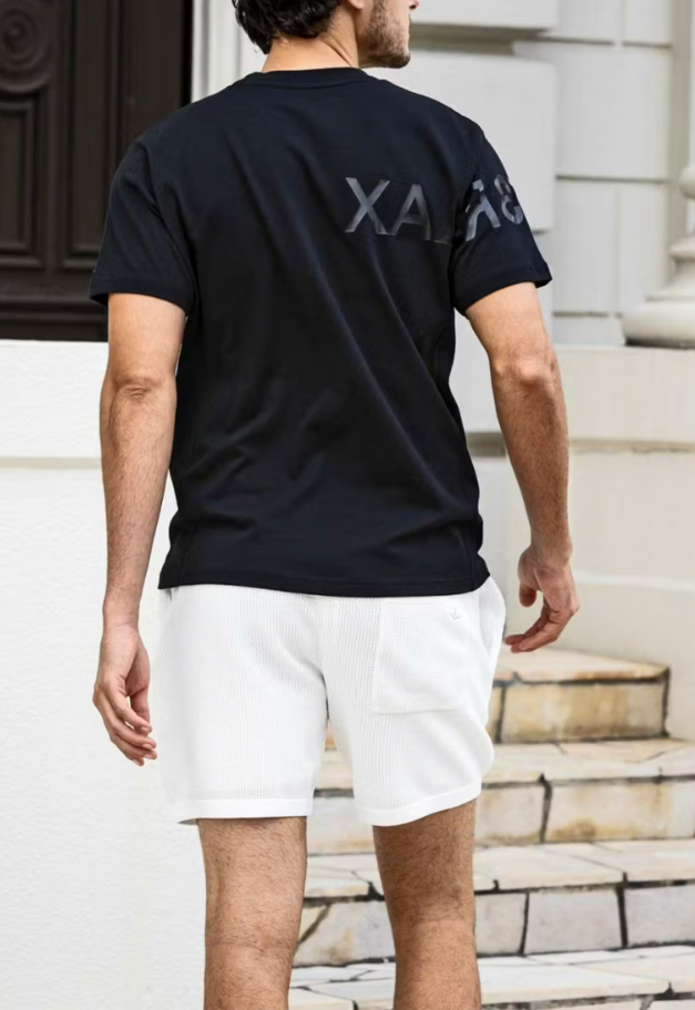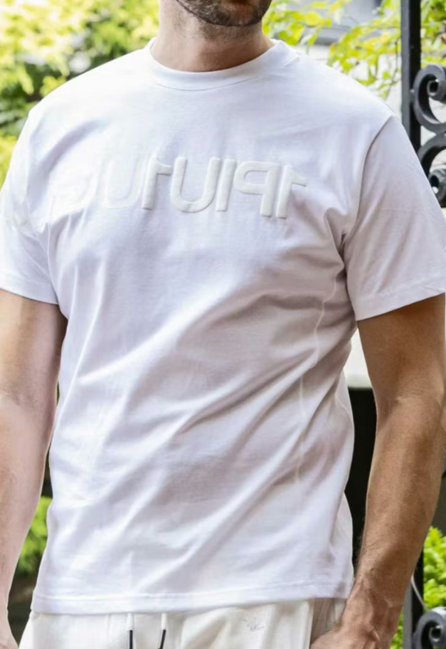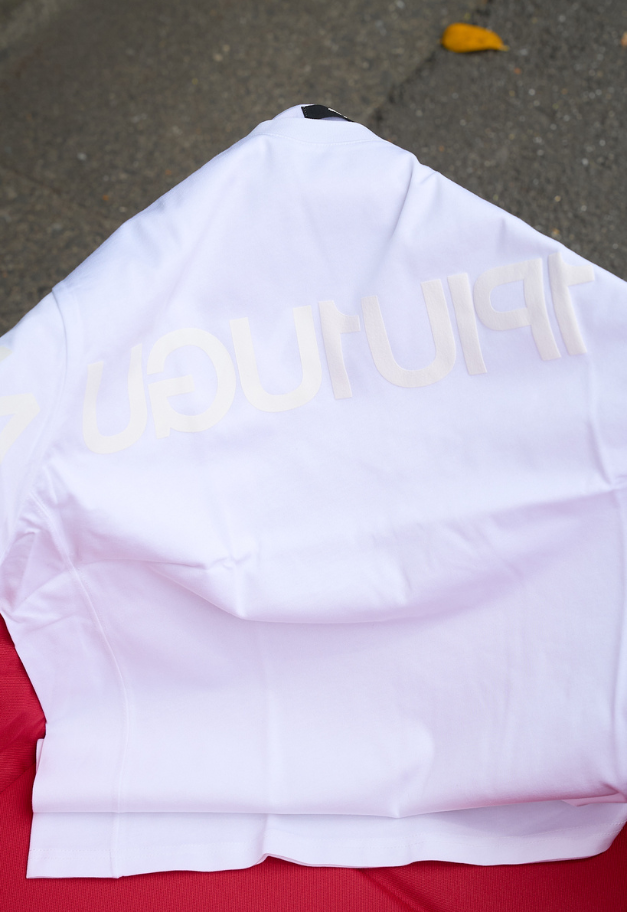 前から後ろに大胆に配置した1PIU1UGUALE3 RELAXロゴがプリント加工の凸凹により立体感を演出しています。