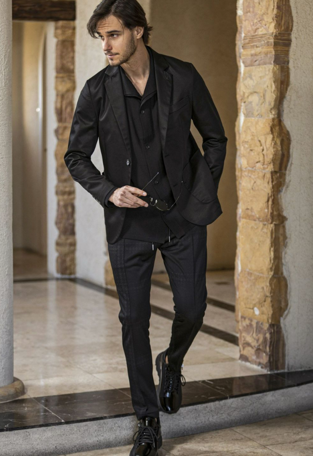 同素材のスラックスと合わせれば、統一感のあるモダンなセットアップスタイルに。