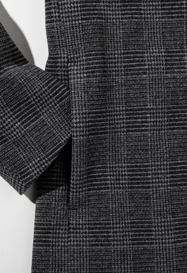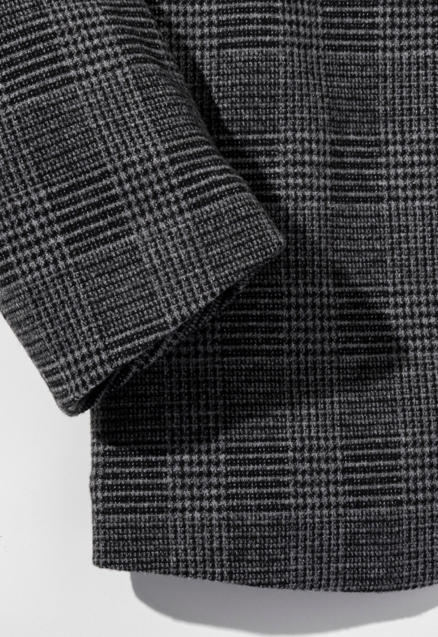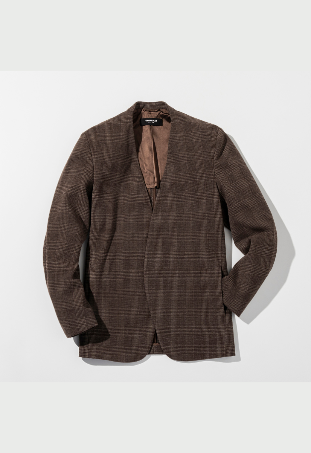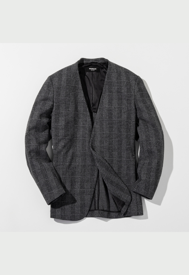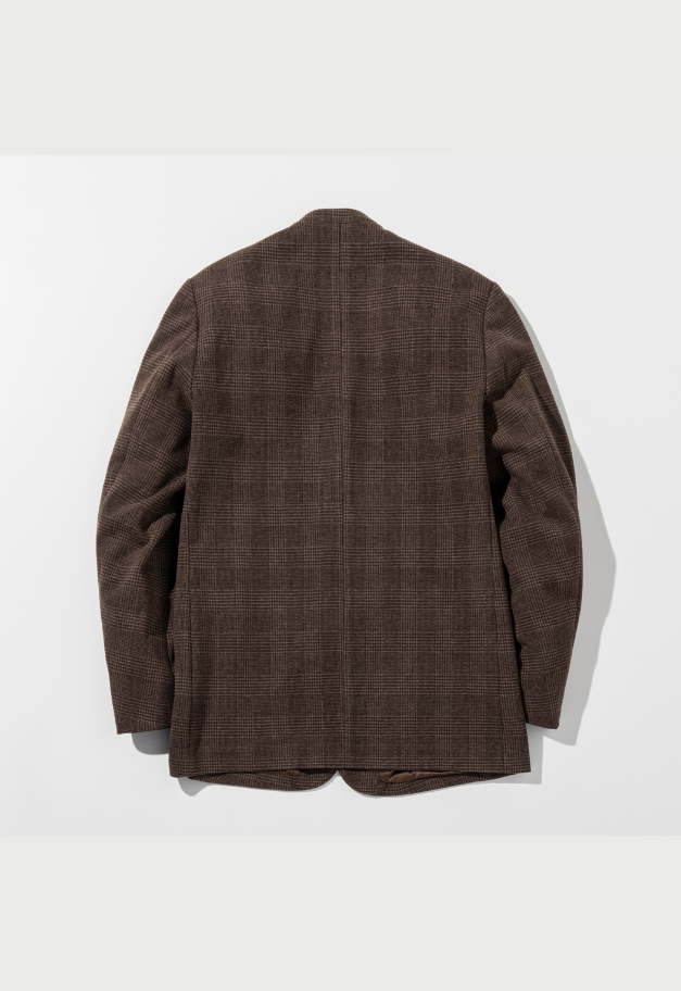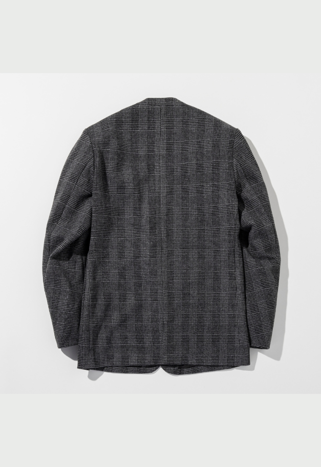 クラシカルなグレンチェック柄が落ち着いた品格を演出するノーカラージャケット。
