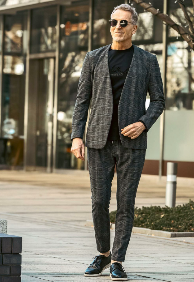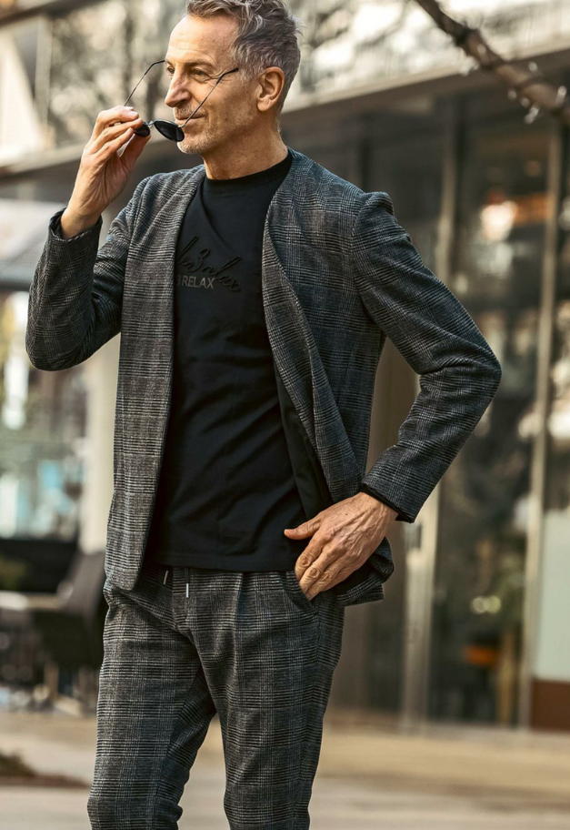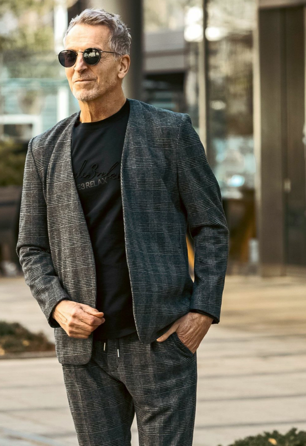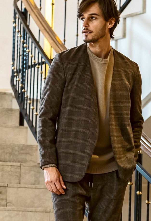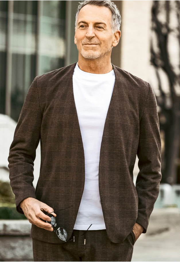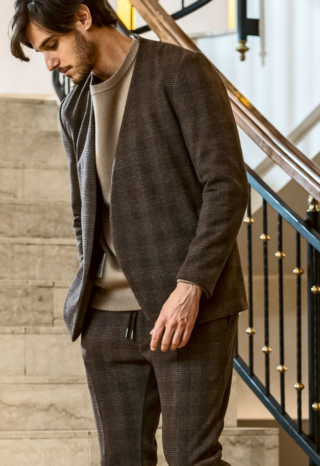 クラシカルなグレンチェック柄が落ち着いた品格を演出するノーカラージャケット。