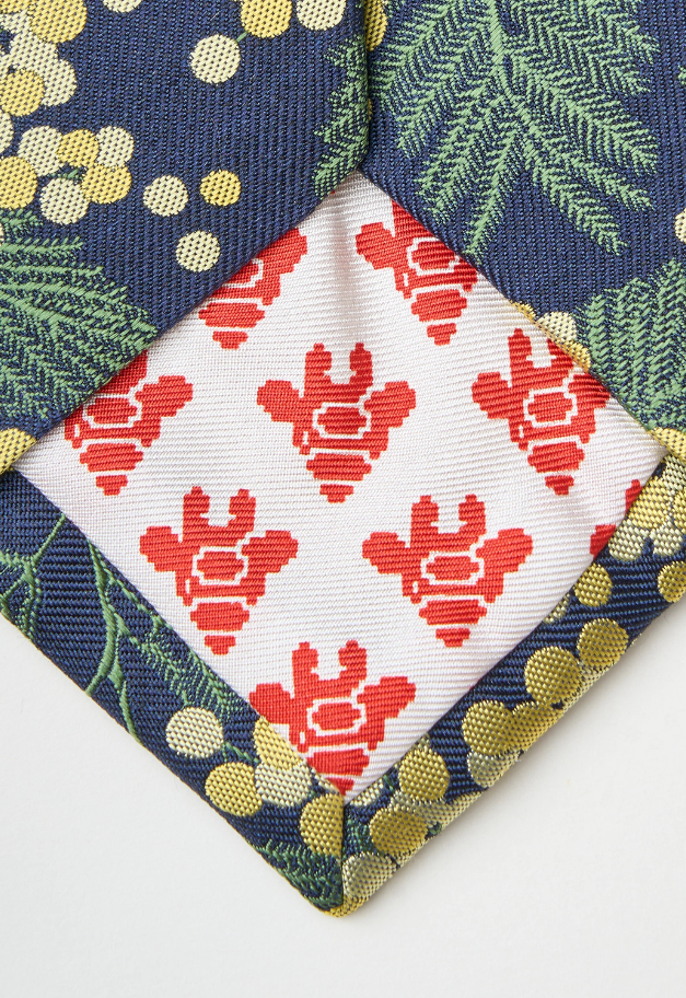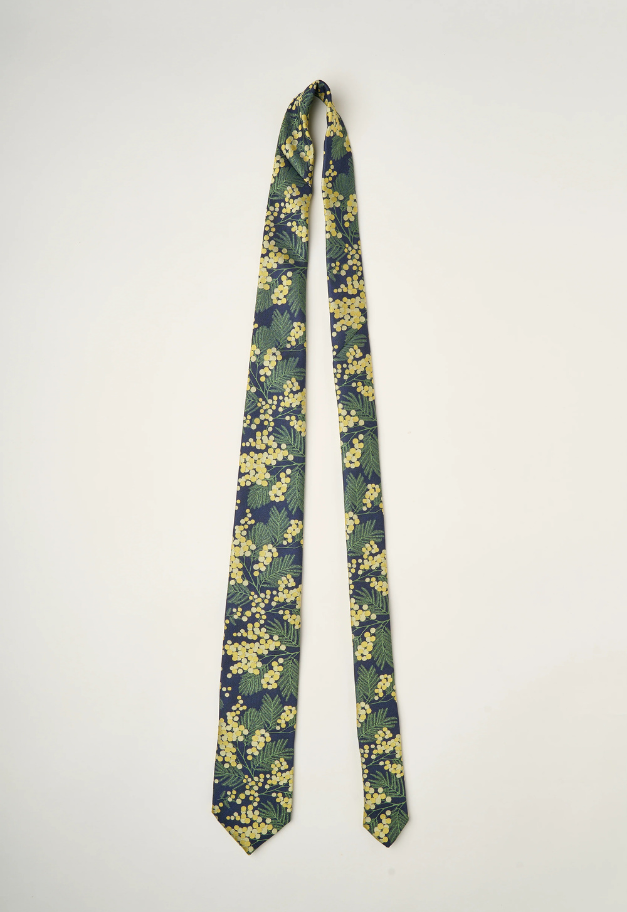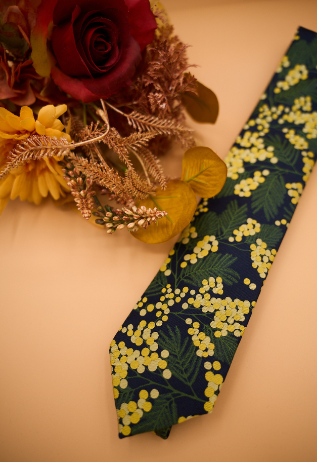 優しくてナチュラルな印象のミモザをデザインした華やかなネクタイは、ウエディングシーンにもおすすめです。