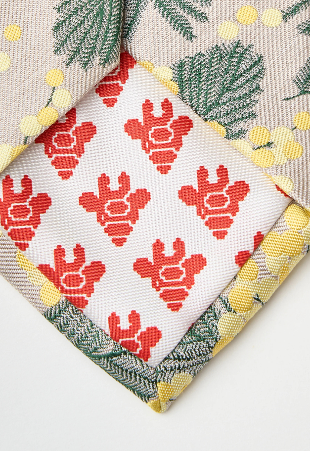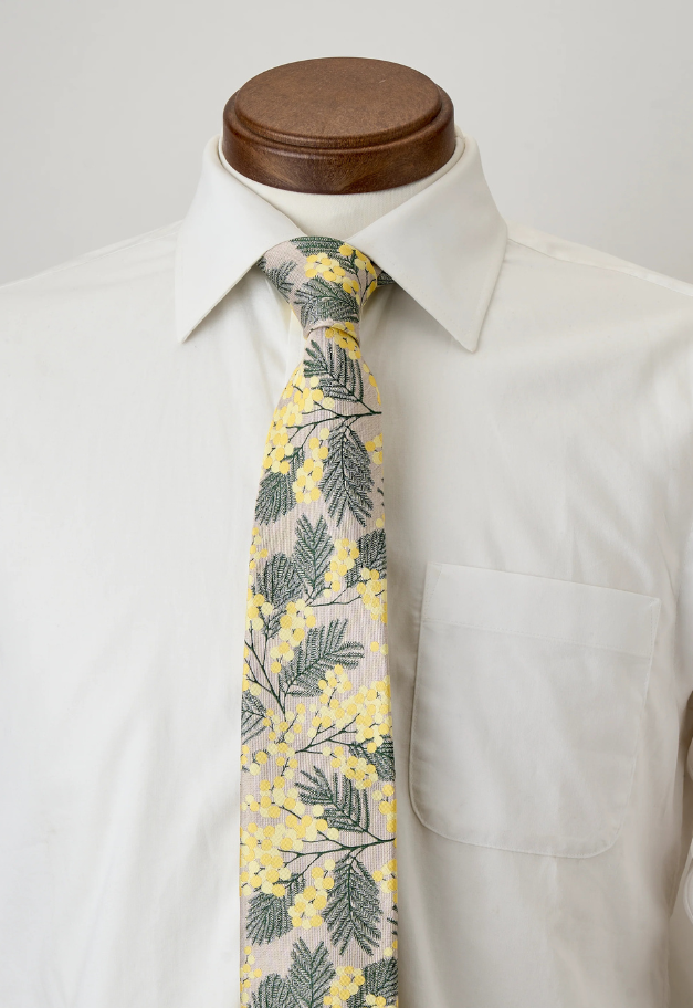 優しくてナチュラルな印象のミモザをデザインした華やかなネクタイは、ウエディングシーンにもおすすめです。