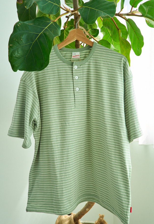 左脇に同色の織柄でさりげなくHealthknitロゴが入ったピスネーム付き。