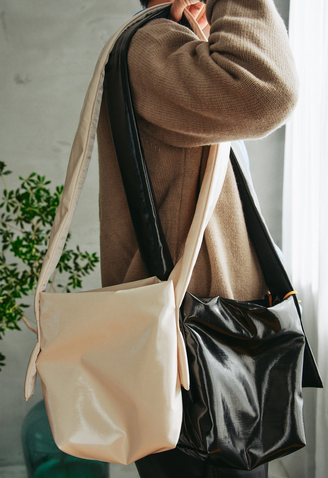 ショルダータイプは肩にかけて使用するだけでなく、持ち手を結んで利用するのもオススメ。