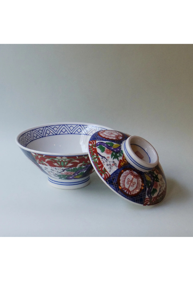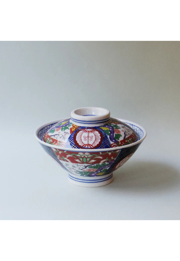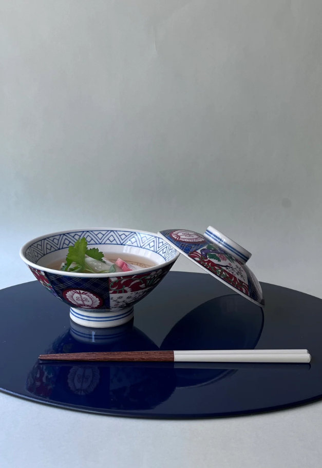 シャープな形の蓋丼はお茶漬け用。用途によって形状やサイズが異なるうつわがあるのは、食を探求する日本ならではの文化です。錦牡丹の華やかな紋様は食欲のない時でも元気を演出してくれます。