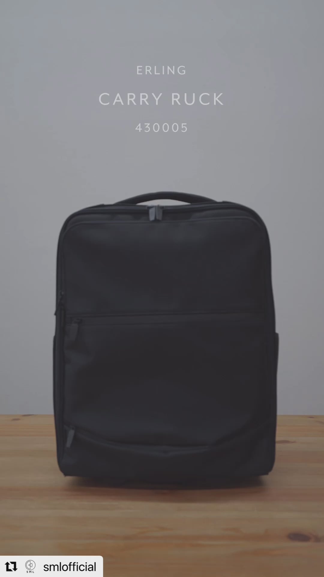 メインスペースはPC・衣類など1〜2泊分の荷物が収納可能なキャリーケースで、外側フロント面には機能性の高いポケット、下部には折り畳み傘用のポケット、サイドにはペットボトルやiPad miniが入るサイズ感のポケットを配置しています。
