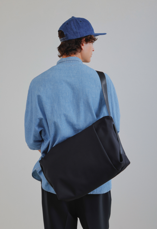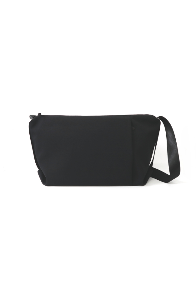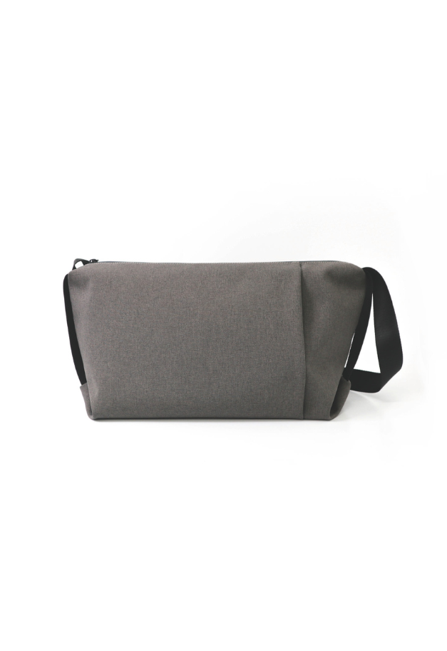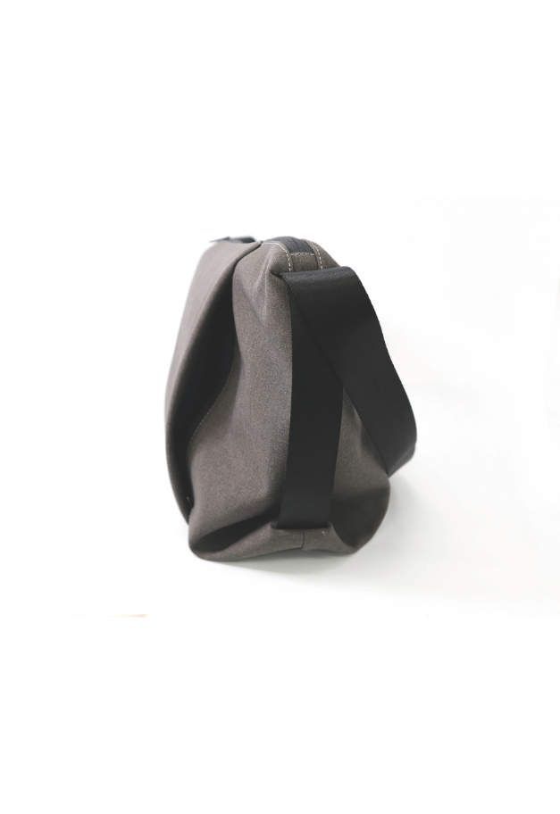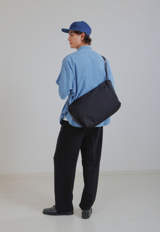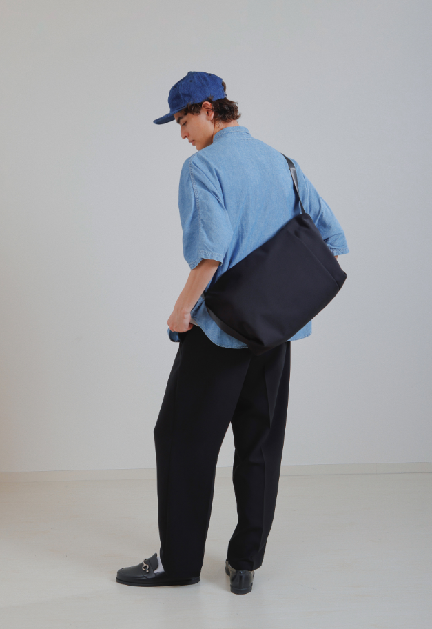 サイドのテープ使いが特徴的な横長なショルダーバッグです。このサイドテープはショルダーを背負った時にバランスよくバッグが吊られるように配置しているのでバッグの変形を楽しんでほしいです。フロントの隠しファスナーポケットも長財布収納可能で利便性を高めています。