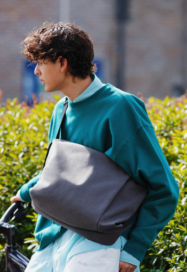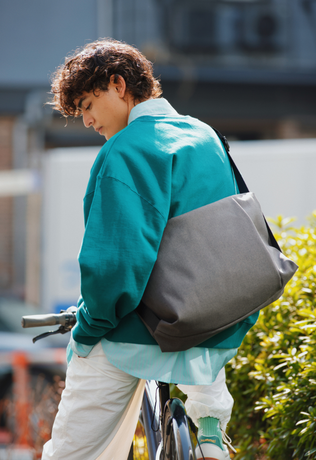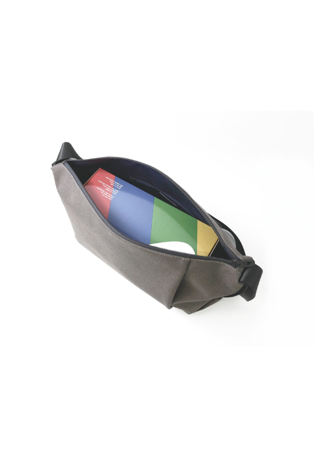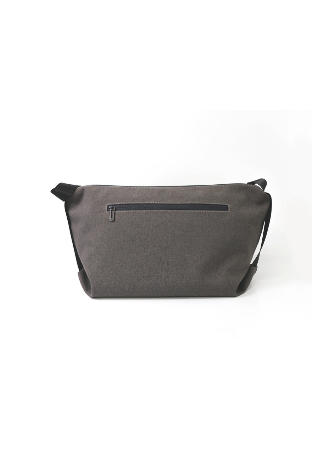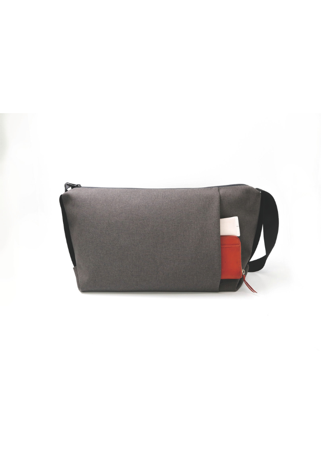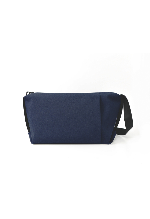 サイドのテープ使いが特徴的な横長なショルダーバッグです。このサイドテープはショルダーを背負った時にバランスよくバッグが吊られるように配置しているのでバッグの変形を楽しんでほしいです。フロントの隠しファスナーポケットも長財布収納可能で利便性を高めています。