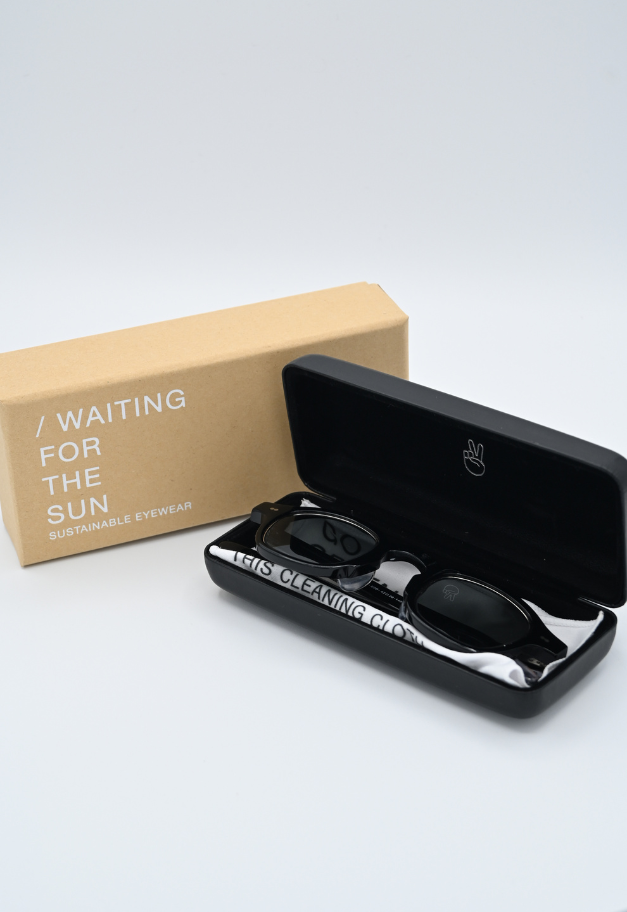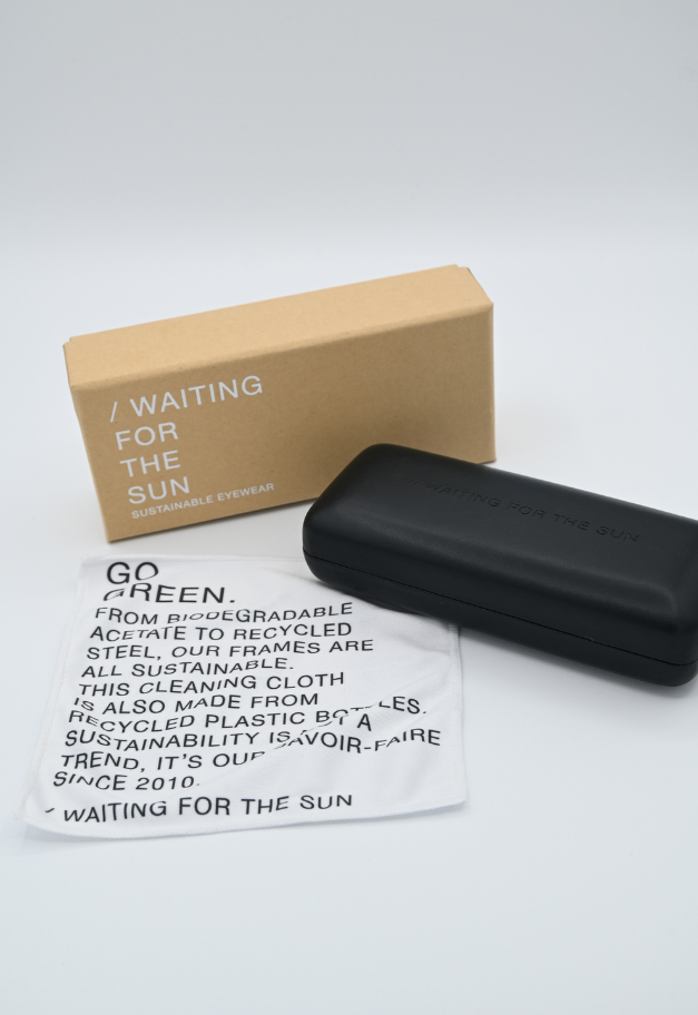 アイウェア業界では、廃棄物が生産プロセスに関与する素材の総重量の 70~80%を占めていると言われています。サングラスに適していて尚且つ地球への悪影響を最大限に抑えられる素材を見つけるのにとても苦労しました。 主にアセテートに使用されるコットンは育てるのにたくさんの水を使用することからWAITING FOR THE SUNの素材としてはすぐに除外されまし た。 WAITING FOR THE SUNのバイオアセテートはリサイクルが可能です。機械加工時にでる廃棄物を収集し、材料の製造過程でその一部を再利用しています。私たちのバイオアセテートはウッドファイバー(木)から作られています。よく管理され、うまく育てられた森林は、温室効果ガスの削減に貢献します。成長する木は、老化する木よりも多くの酸素を放出し、より多くの CO2 を吸収します。 私たちのプラスチックフレームは 100% 生分解性プラスチックです。このバイオアセテートは生分解性試験に特化した国際的に認められた独立した研究 所であるOWS(Organic Waste Systems)によって検証および認証されています (ISO14855 に準拠)。
