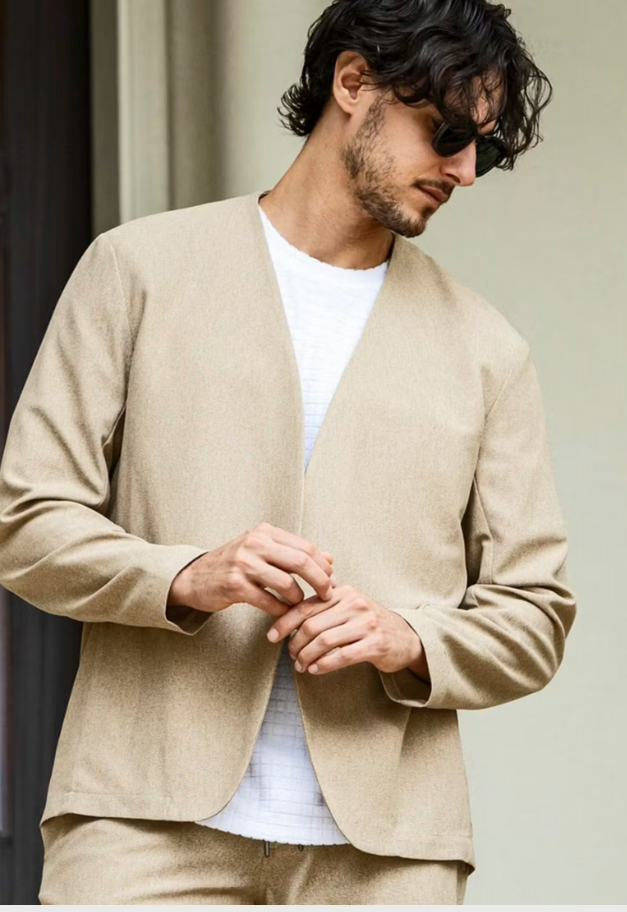 トレンドの襟無しジャケットなのでかっちりしすぎない大人の余裕を演出します。