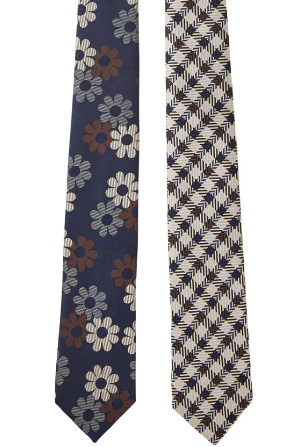 インパクトのある大きな花柄に、ヘリンボーン織りのカラフルなチェック柄を組み合わせた、両面使えるリバーシブルタイです。