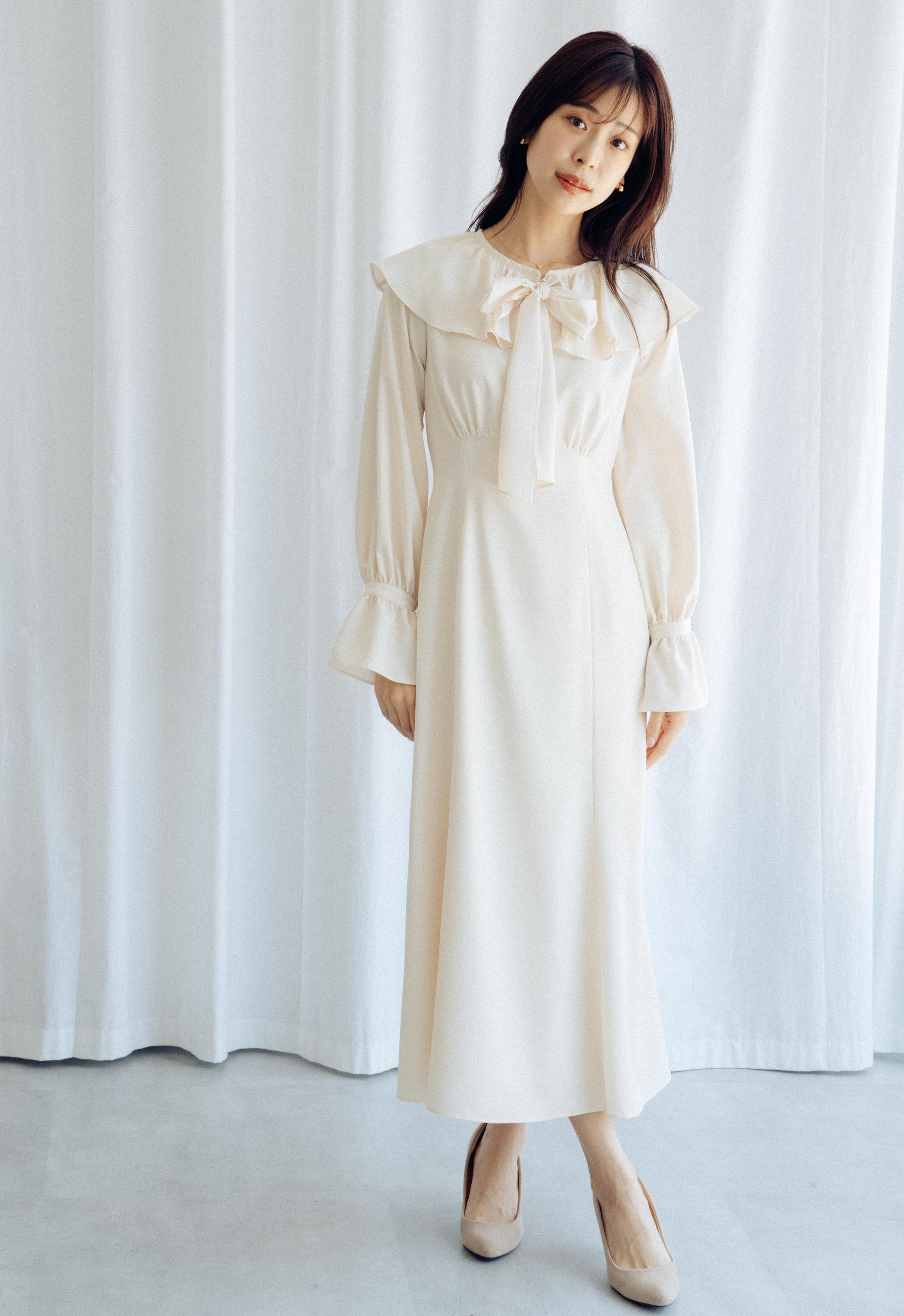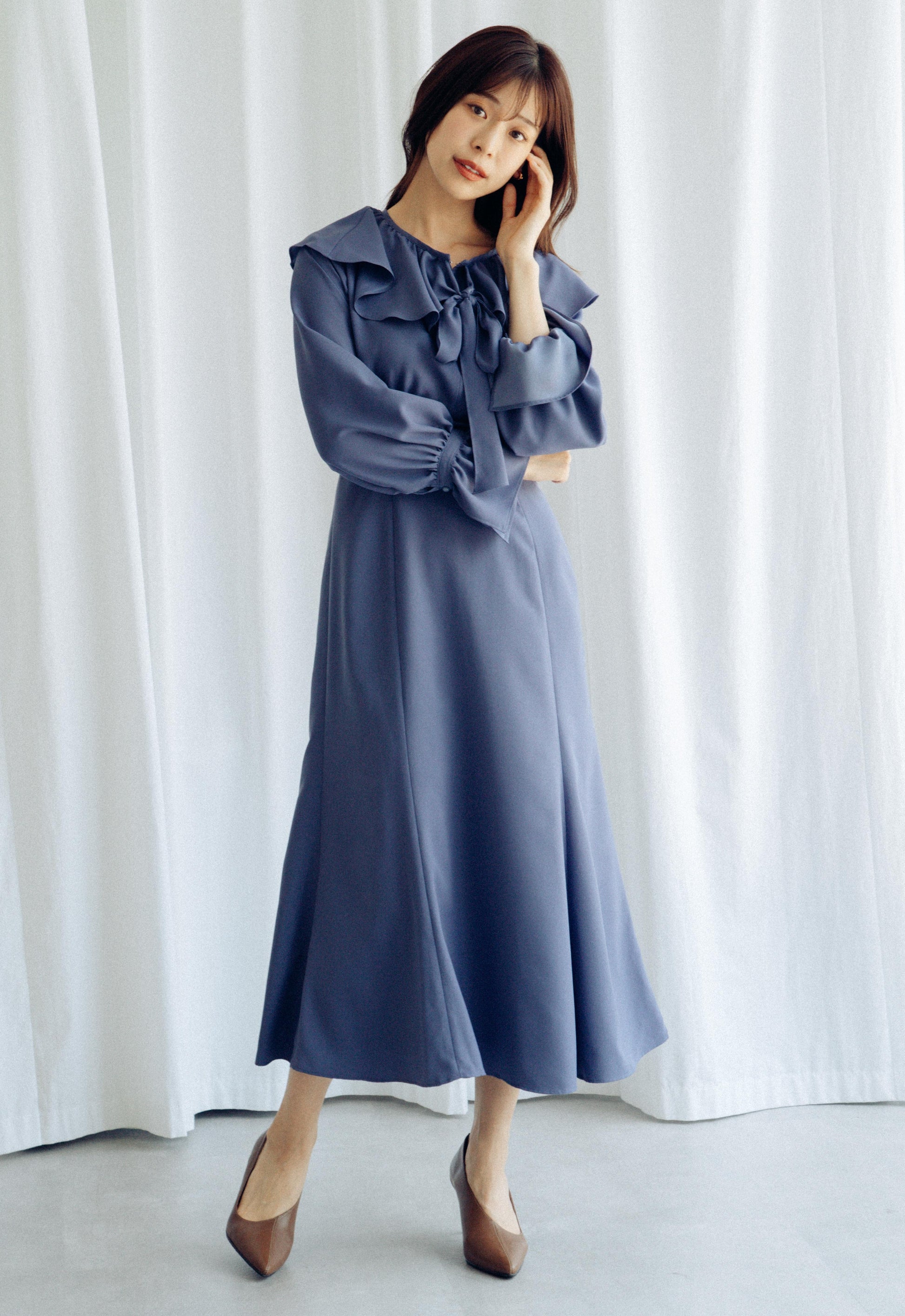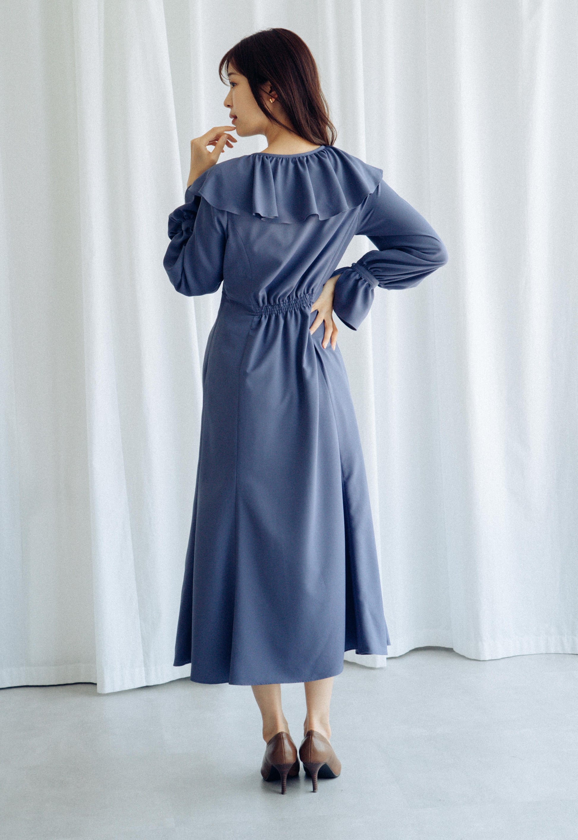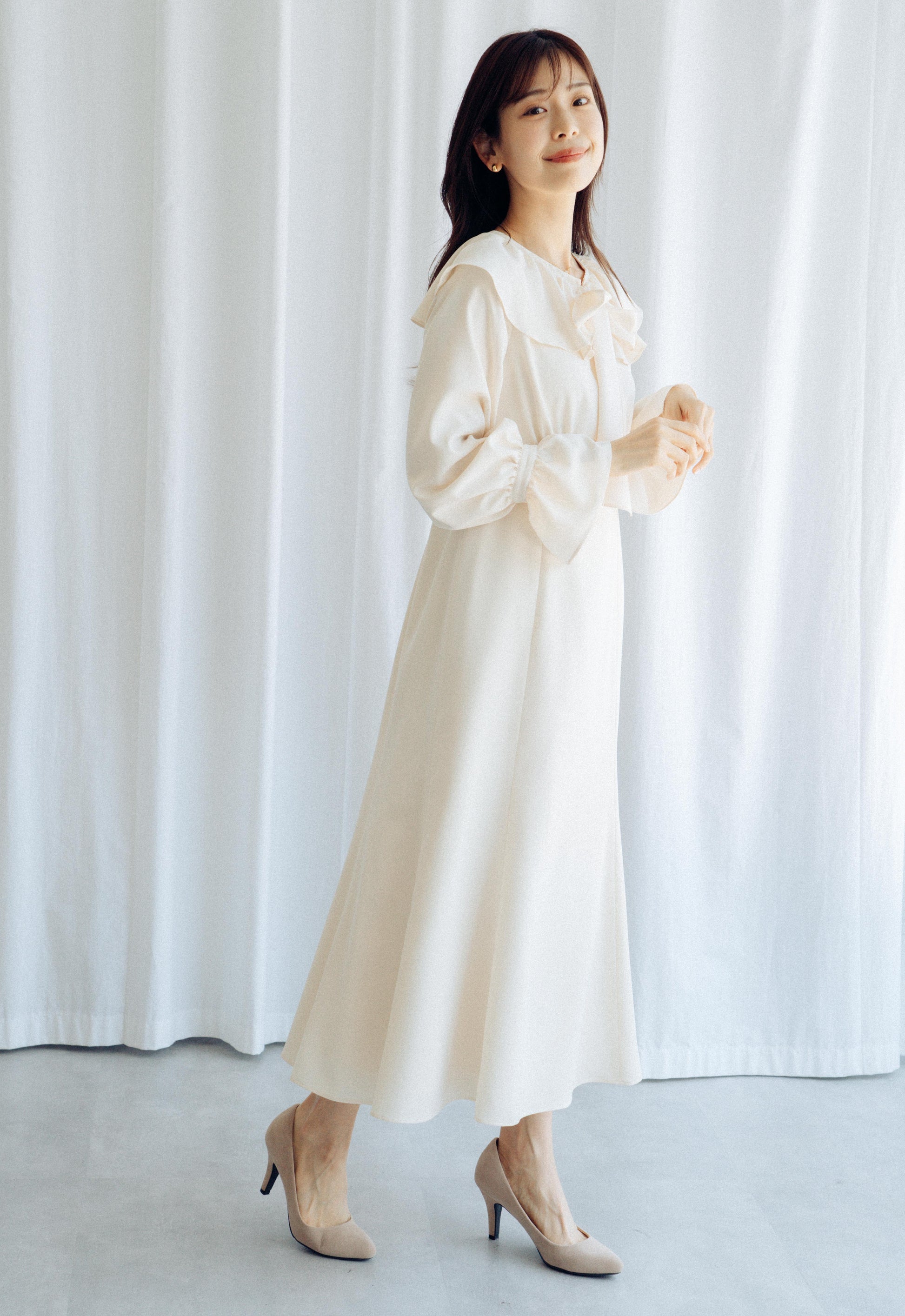 顔まわりをいっきに華やげるラッフル襟のワンピース。