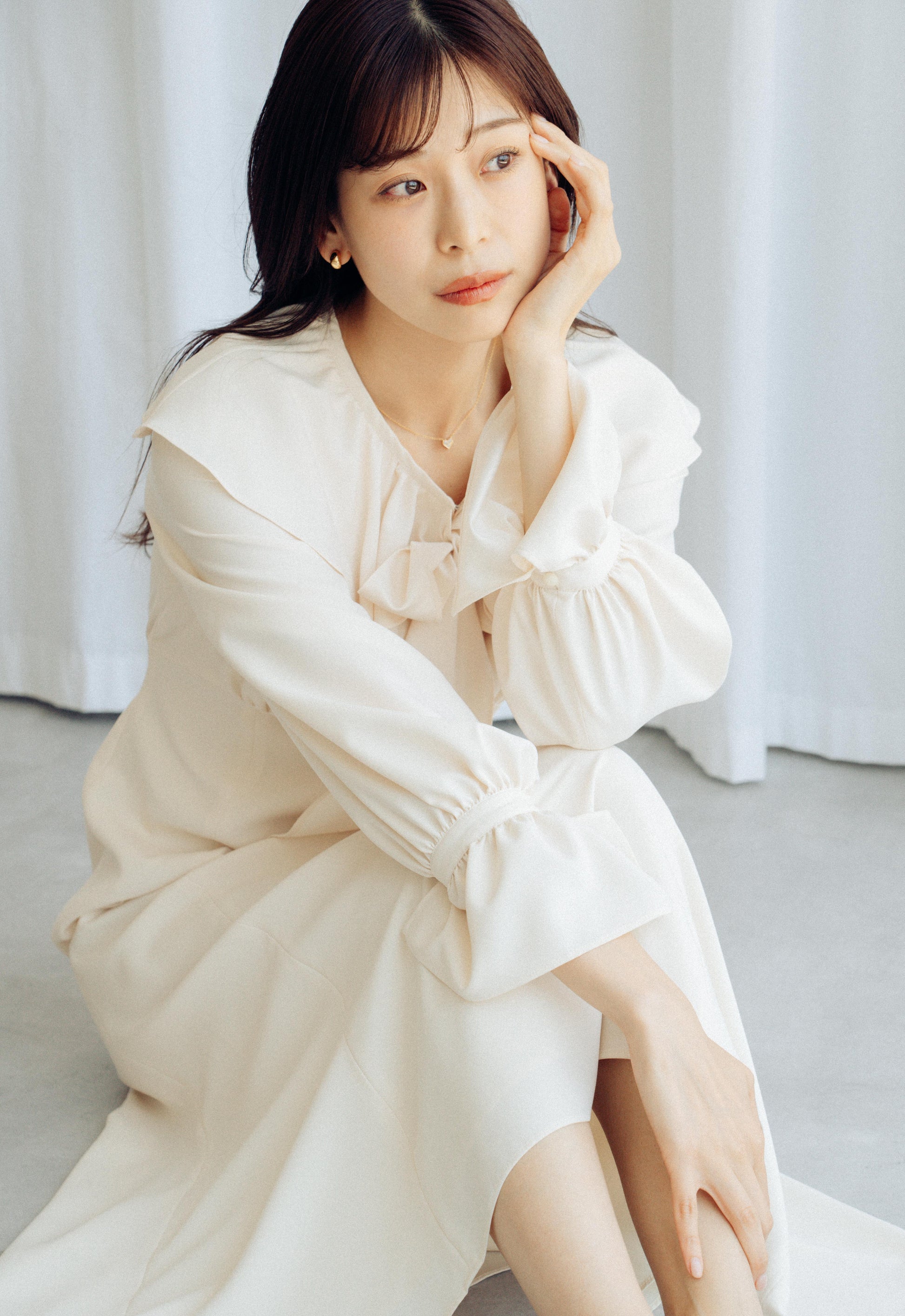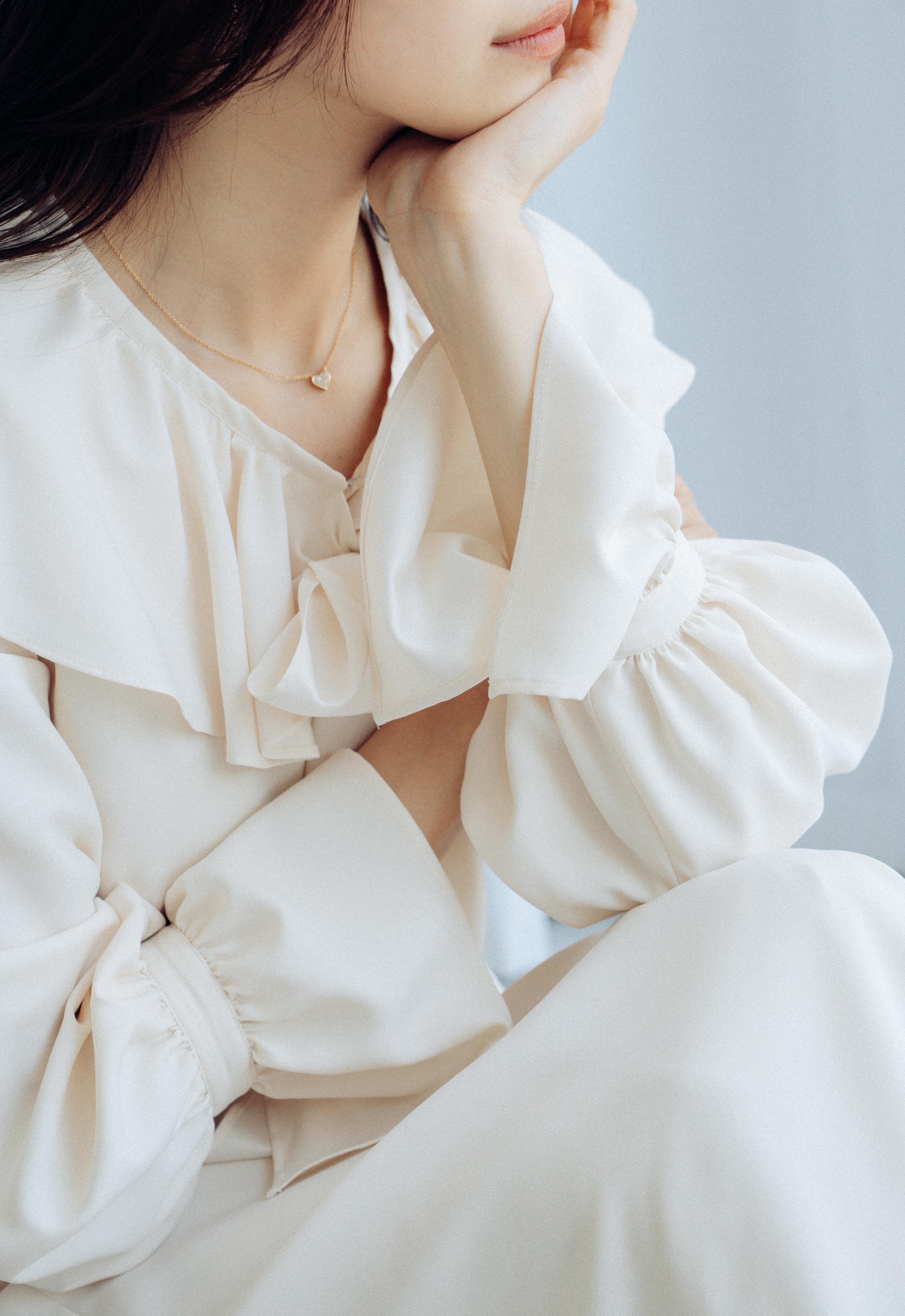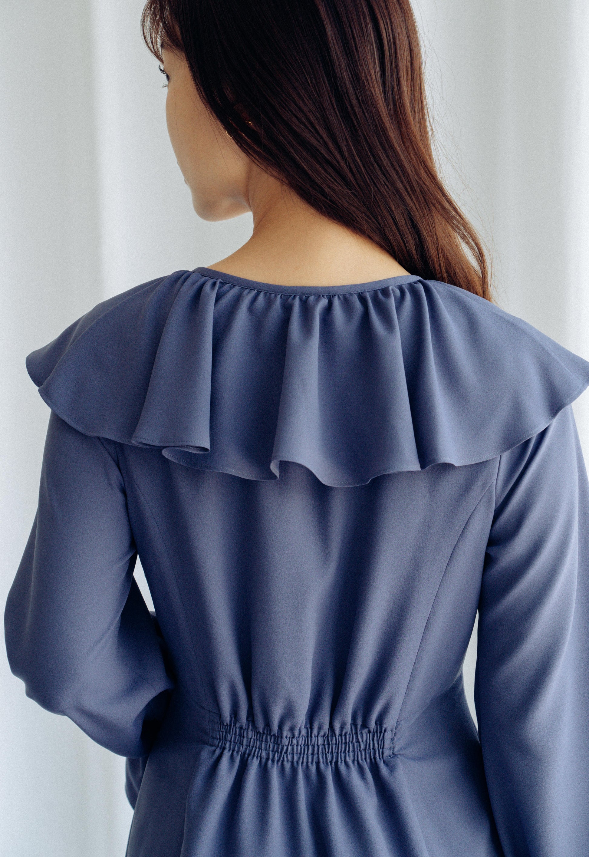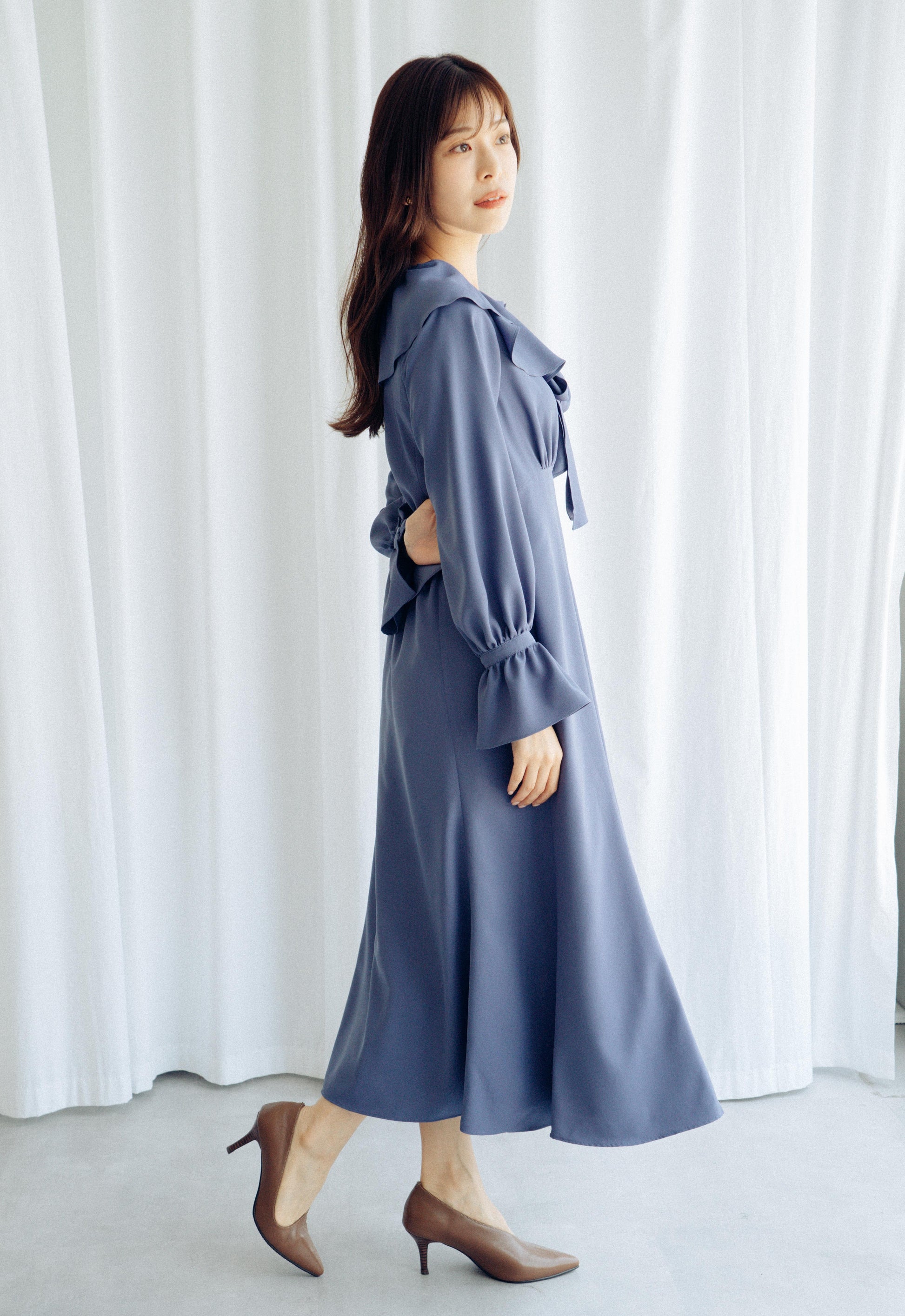 顔まわりをいっきに華やげるラッフル襟のワンピース。