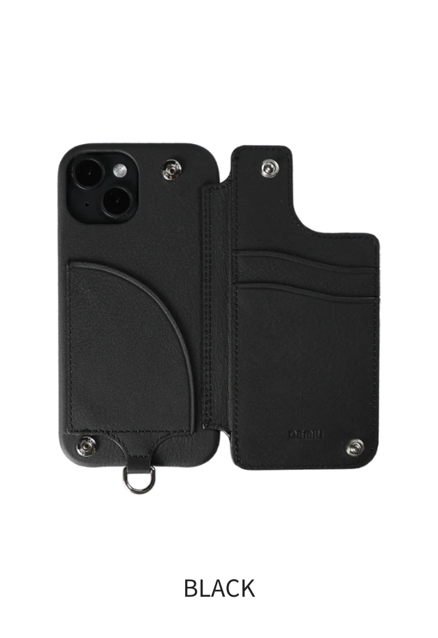 思わず目を惹かれるデザインと質感で存在感抜群のアイテムです。右扉の内側に2段のカードスリットと隠しポケット、左側に収納ポケットを備えた便利なアイテム。