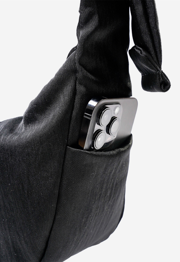 TOWN MOON BAG シリーズの中でも最もコンパクトな三日月型ショルダーバッグ。カメラや財布、スマートフォン、さらにはペットボトルなど、ちょっとしたお出かけ便利なサイズ感です。オリジナルで製作した中綿入りのナイロン素材は、ミリタリーな雰囲気を漂わせつつも、上質なラグジュアリー感を演出。持ち手が下にたわむことで、美しいシルエットを実現しています。アジャスターリングで持ち手の長さを調整する事ができ、斜め掛けにも肩掛けにも対応しています。肩当て部分の中綿を抜いた事で肩のフィット感向上とショルダー調整のスムーズさを実現。ミニマルなデザインながら、両サイドに配した外ポケットや内部のファスナーポケットが充実しており、機能性も抜群です。