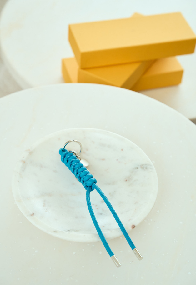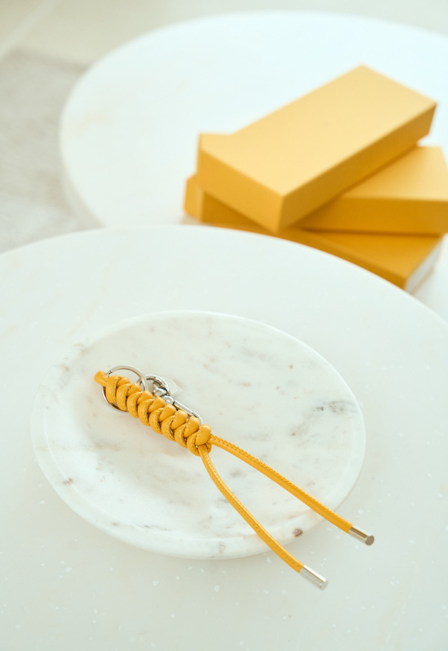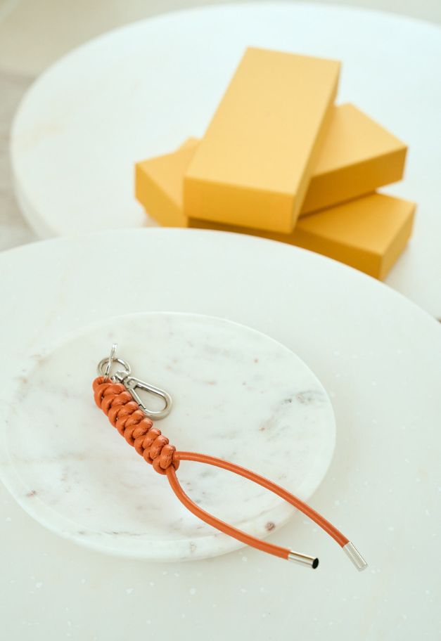 バッグのハンドルやベルトループに通すだけで、装いにさりげない個性とニュアンスを添えてくれるこのアイテムは、キーリングとしてはもちろん、アクセサリー感覚でも楽しめるレザー小物。