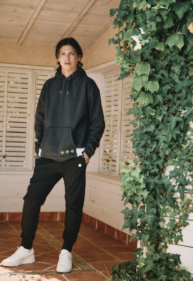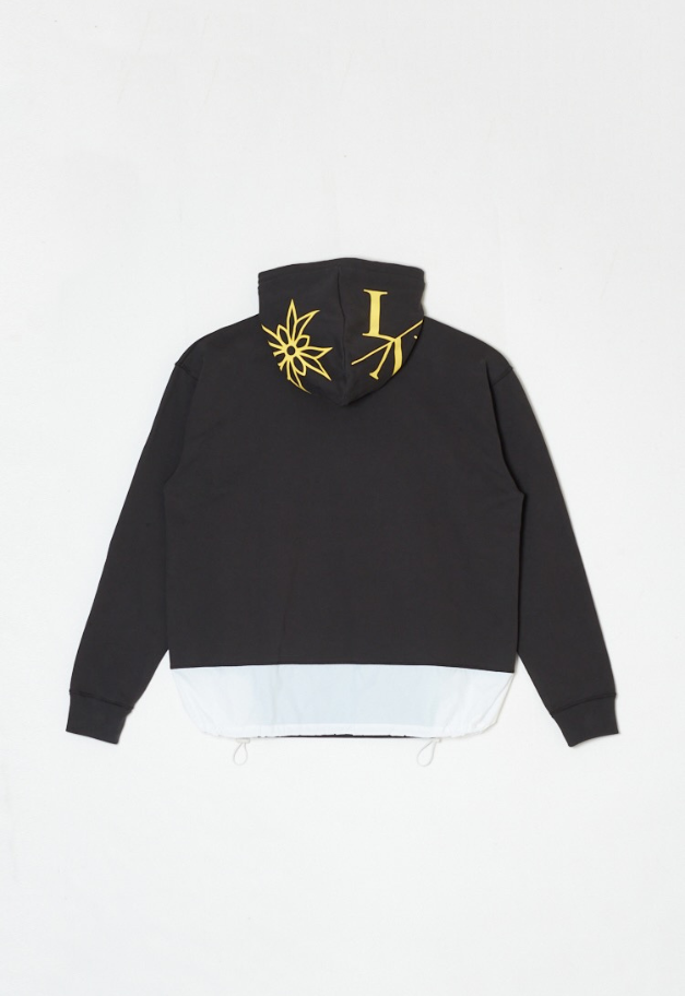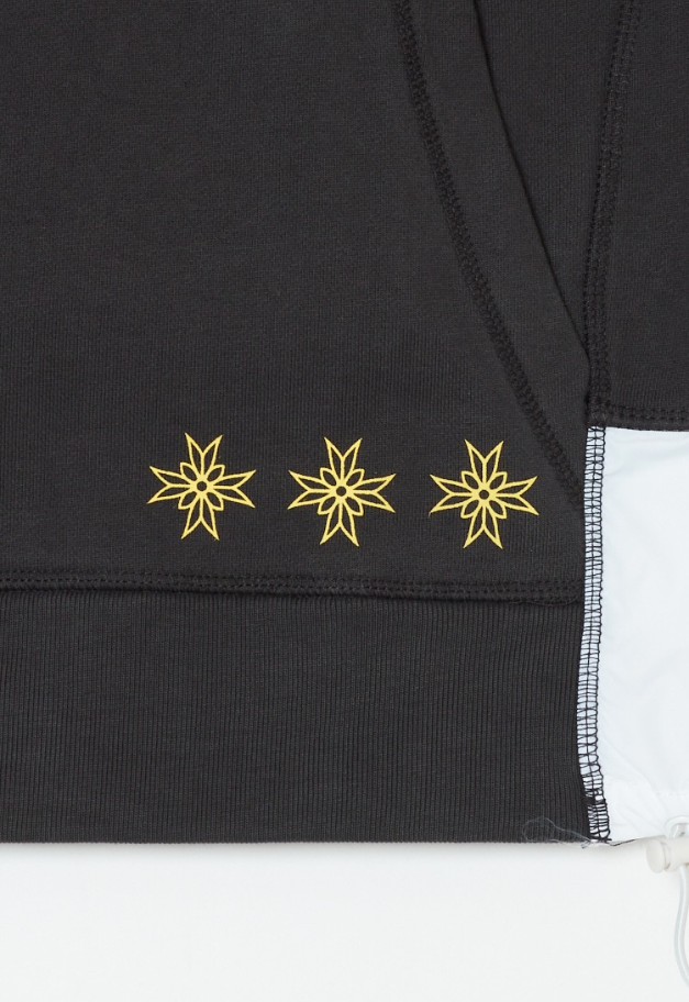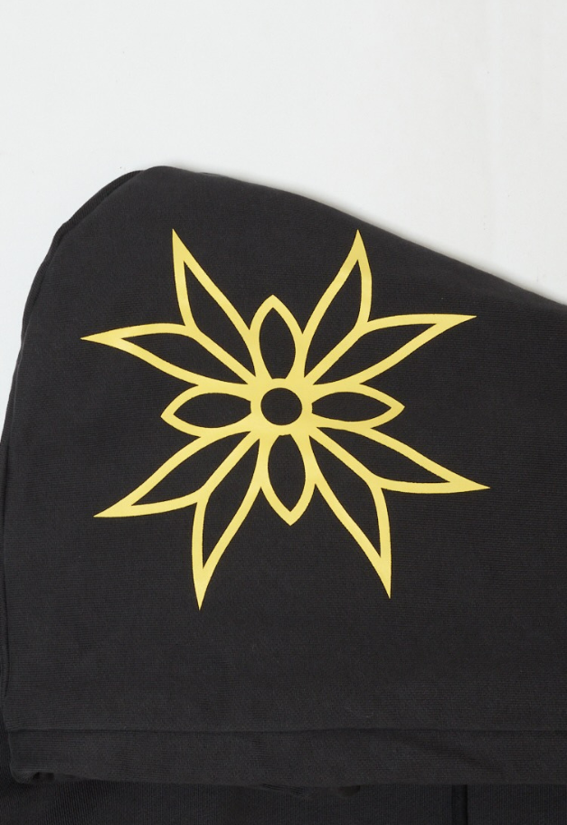 ◉シックなブラックに、イエローの花柄とロゴプリントが映えるデザイン