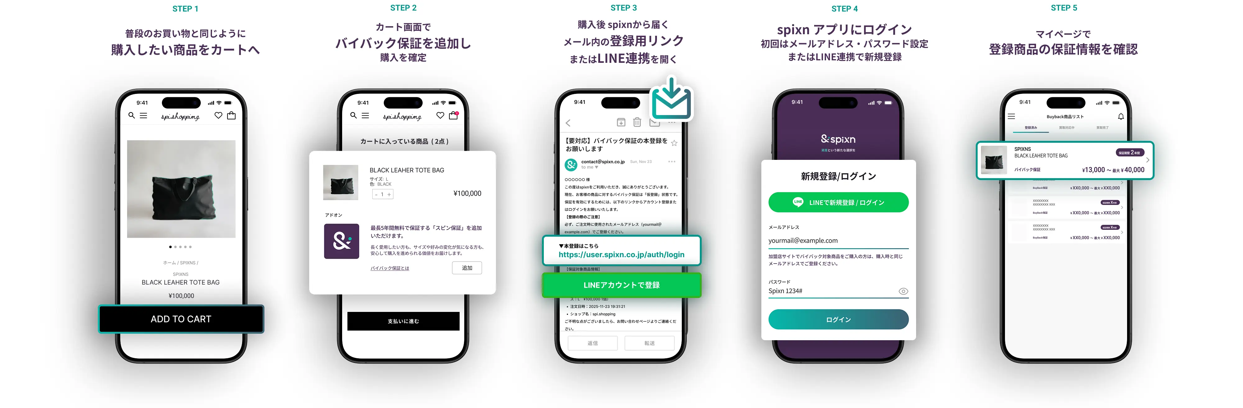 - すでに spixn にご登録済みの方は、バイバック保証の購入時に登録メールアドレスを入力するか、LINE連携後に「アカウント情報」で同じメールアドレスを統合いただくことで、自動的に保証が紐づきます。