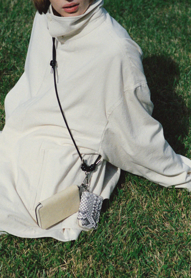 ショルダーパーツやコード用として国内工場で開発した、機能性と美しさを兼ね備えたレザーコードです。ベースには、適度な張りと柔らかさを持たせたスムースレザー“RAPTO JP LIGHT”を使用。伸びすぎず硬すぎない絶妙なバランスで設計されており、使用感と耐久性の両立を実現しています。さらに、極薄仕様を想定した強度としなやかさを保ちながら、丁寧にステッチを施すことで、上品な表情と構造的な安定感をプラス。ショルダーストラップやアクセサリーの一部として、プロダクト全体の完成度を高めるディテールです。